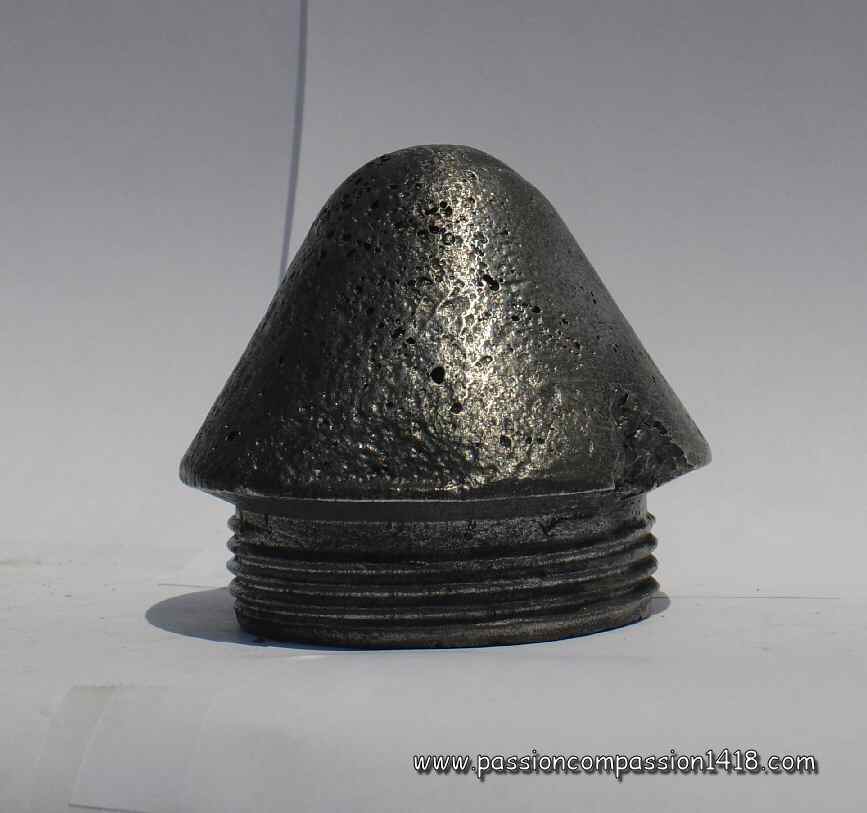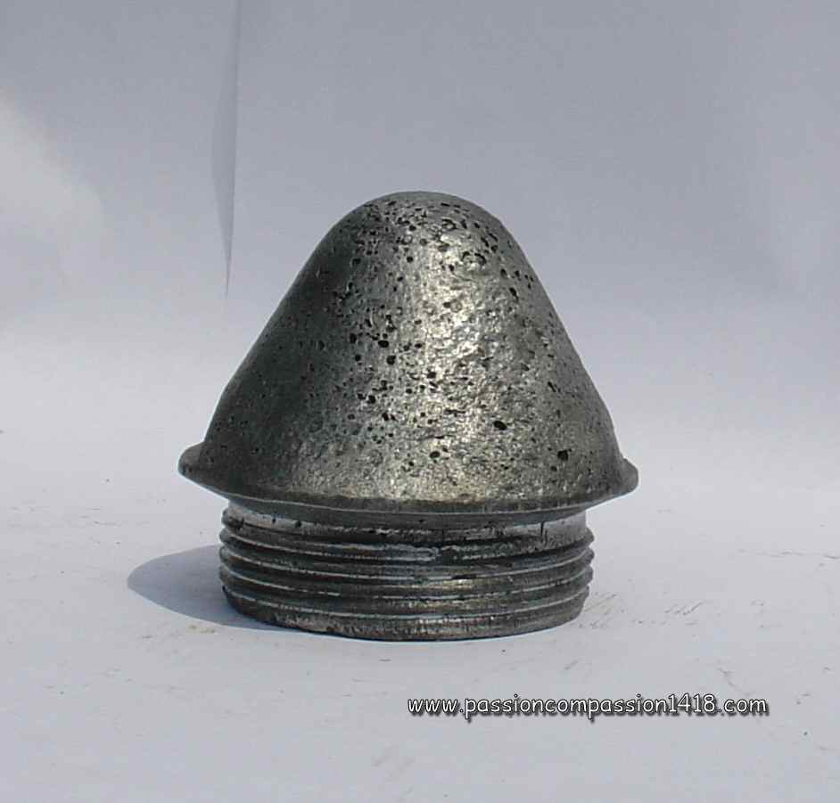 That plug type is often observed in some museums mounted on German minenwerfer shells. Its material is zamac, a poor alloy of Zinc with Magnesium, Aluminium, and Copper. The thread diameter is 55 mm. |