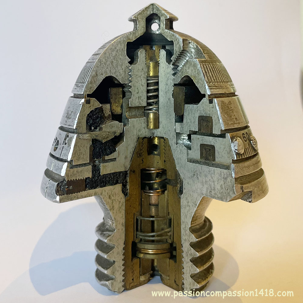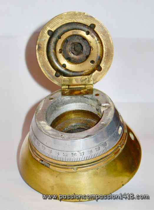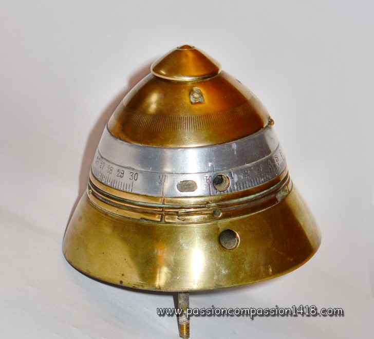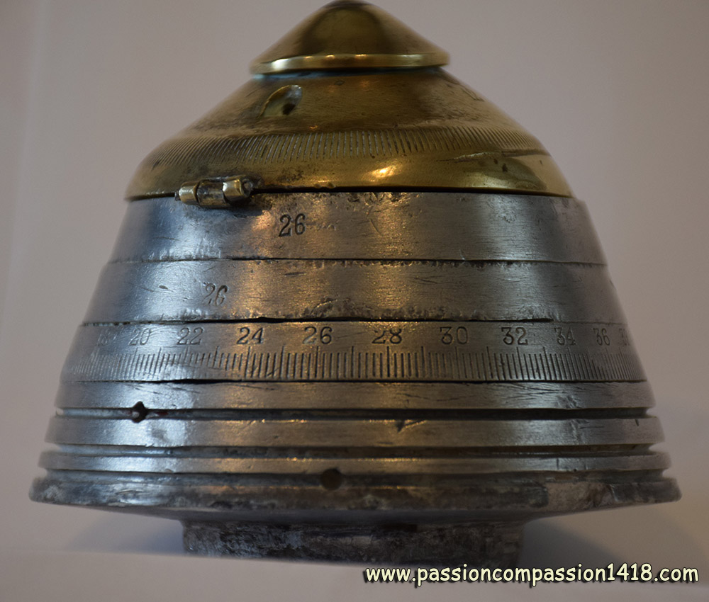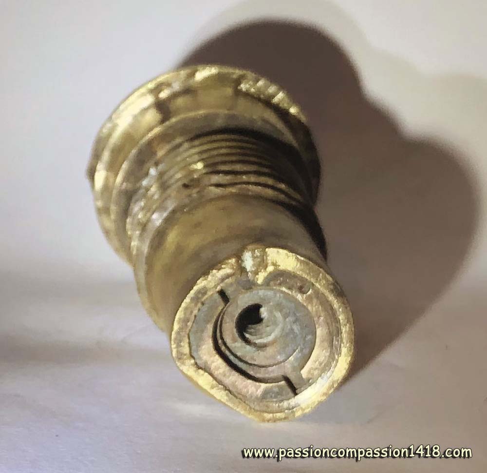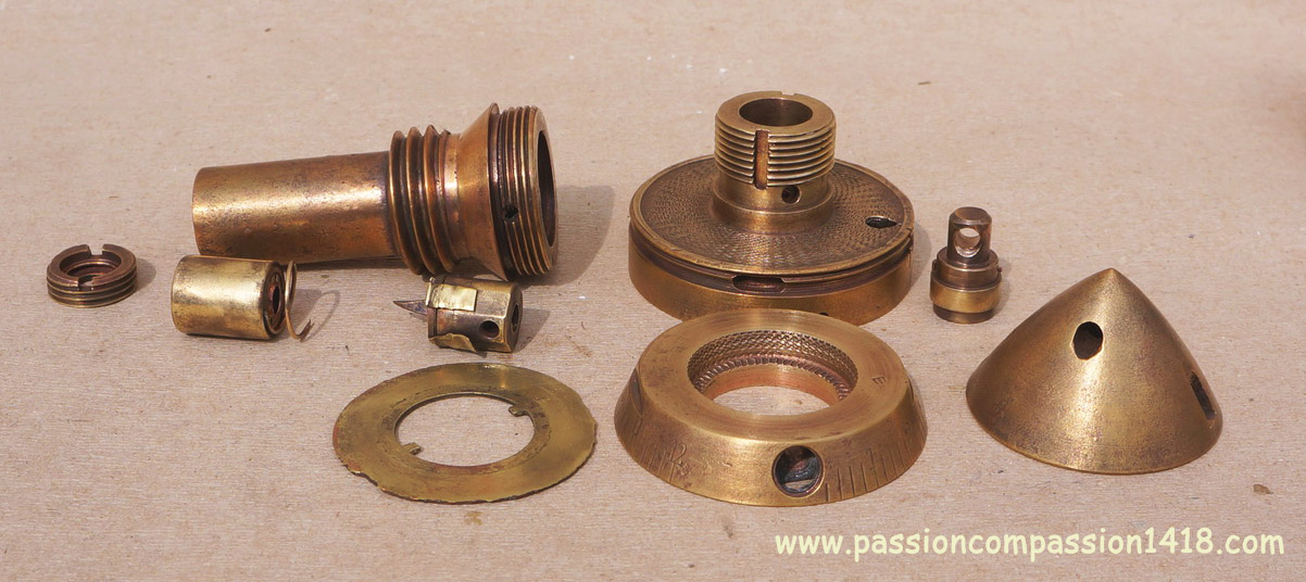 This 6 GT type percussion fuze, was composed, from head to tail, with a inertia concussion arming system with locking staple and safety spring, a hollow massive mobile cylinder housing a long static percussion needle, positionned axially through an integrated detonator and bearing at its lower extremity the primer cap that was kept at rest inside the safe detonation room preventing the effects of an unwanted premature triggering.