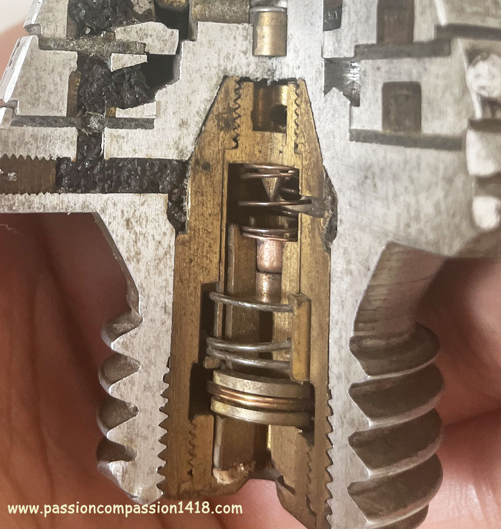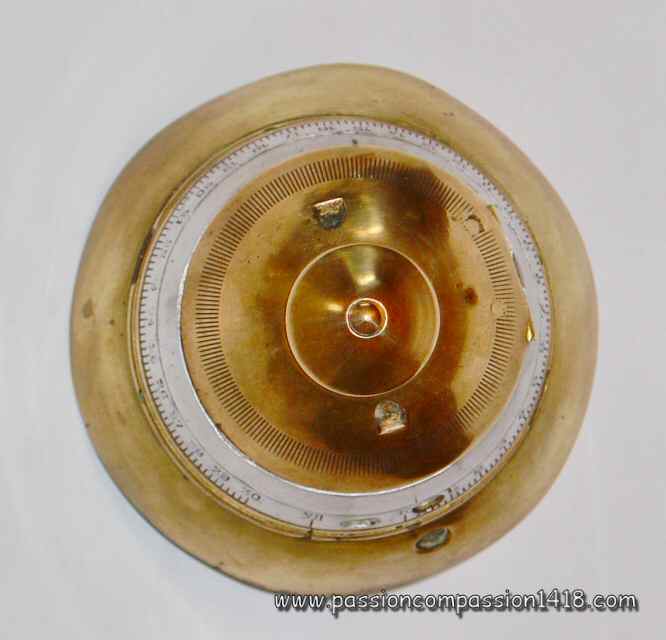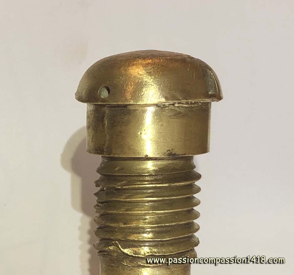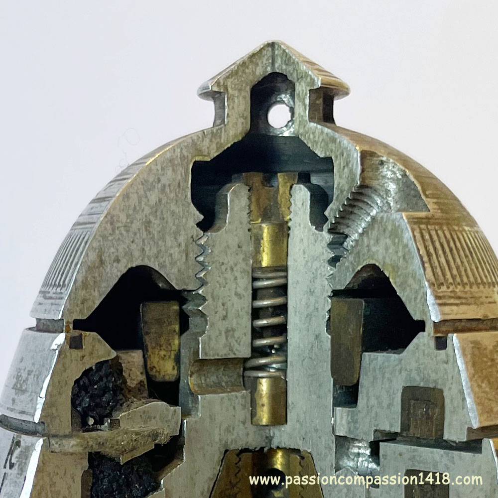 This 6 GT type percussion fuze, was composed, from head to tail, with a inertia concussion arming system with locking staple and safety spring, a hollow massive mobile cylinder housing a long static percussion needle, positionned axially through an integrated detonator and bearing at its lower extremity the primer cap that was kept at rest inside the safe detonation room preventing the effects of an unwanted premature triggering.