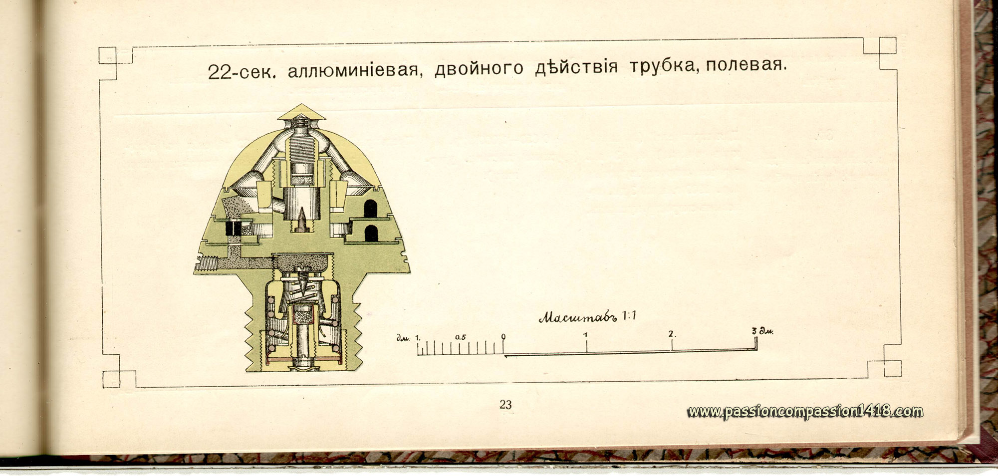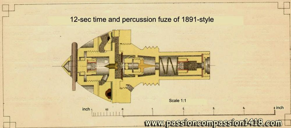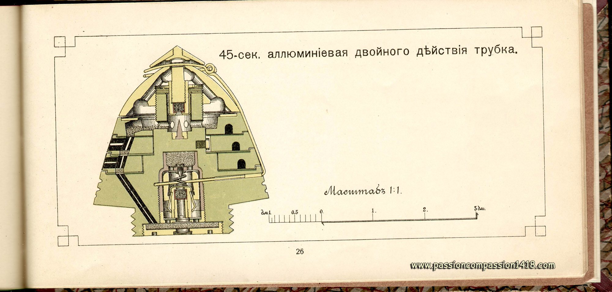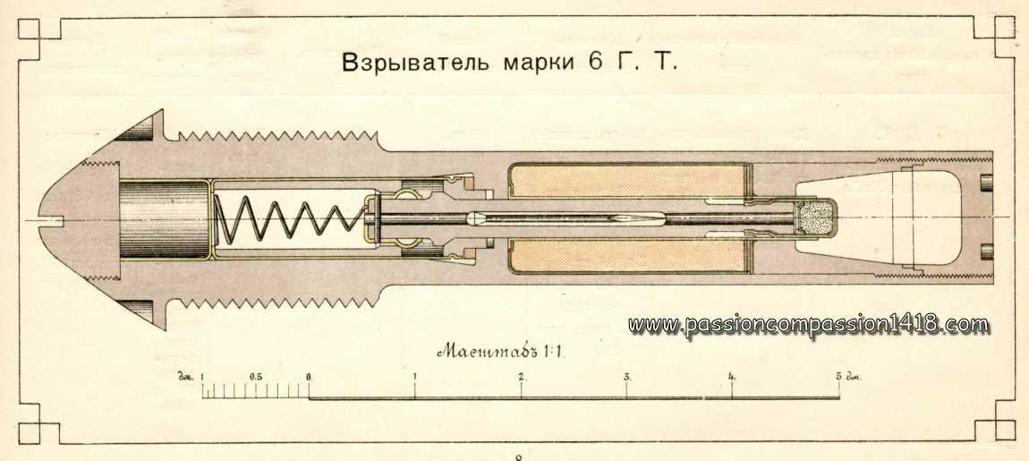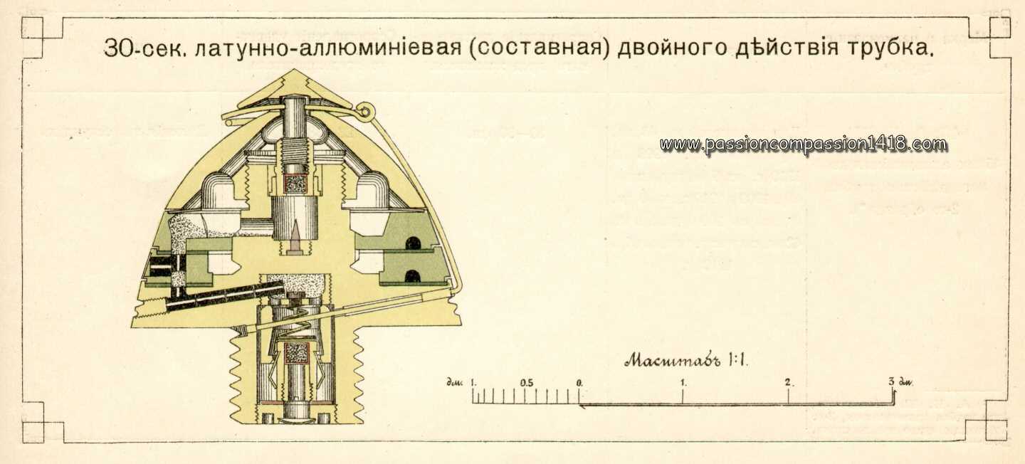 The other main families of the 'native' Russian percussion system was designed on the basis of a different prociple, but also present in some German fuzes such as the GrZ 96/04, built around a detonator integrated in a median position of the fuze body, and a safe detonation room housing the primer at rest.