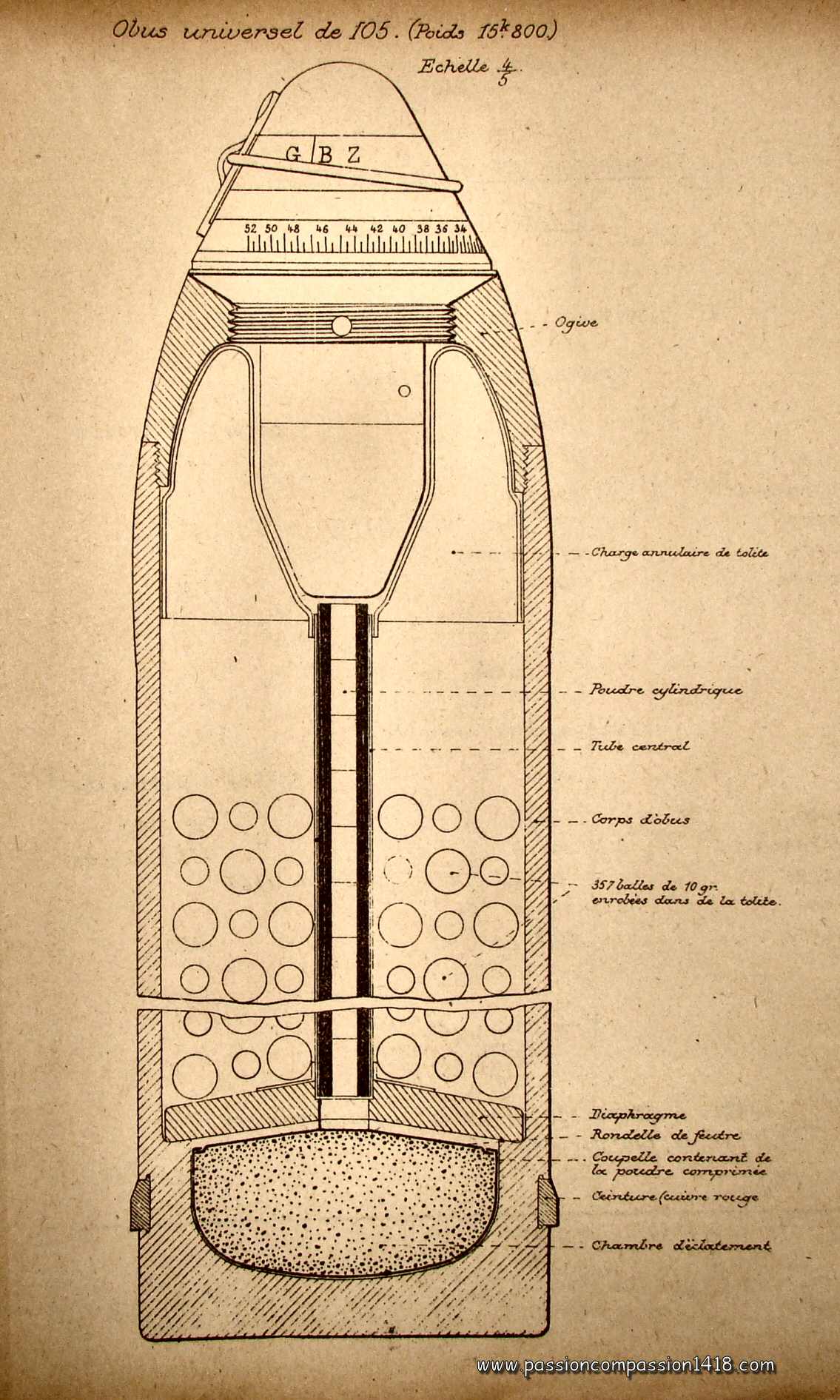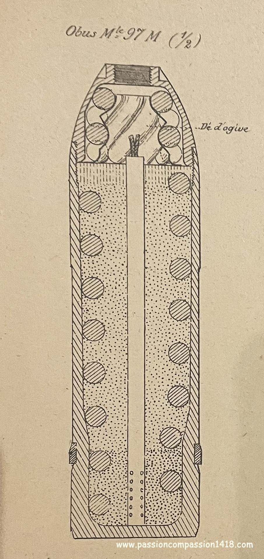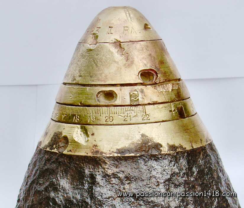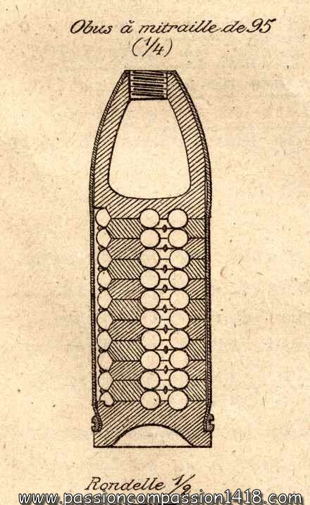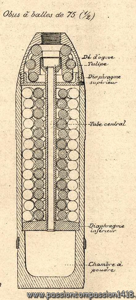 In August 1914, the shrapnel shells were the main ammunitions of the field artillery. Designed to burst right over the ennemy troops by the means of a specific time setting device (time fuze), they were spreading an deadly lead bullets and steel fragments rain while producing a smoke cloud that allowed the gunners to tune their aiming.