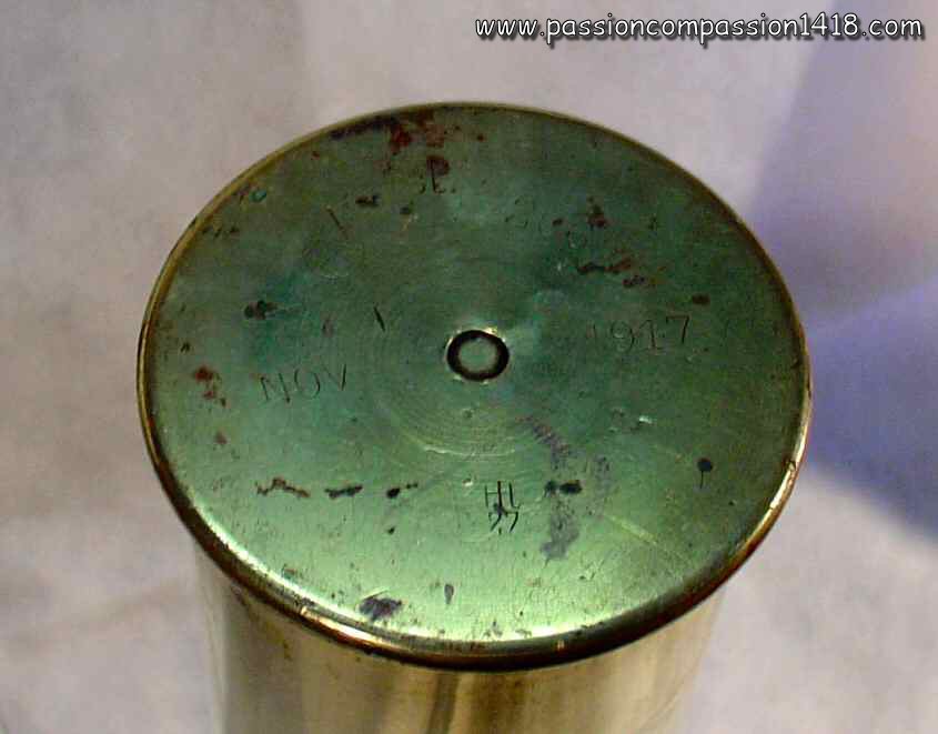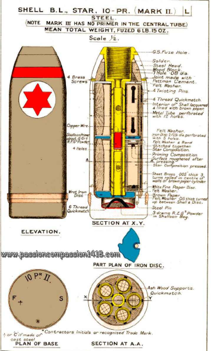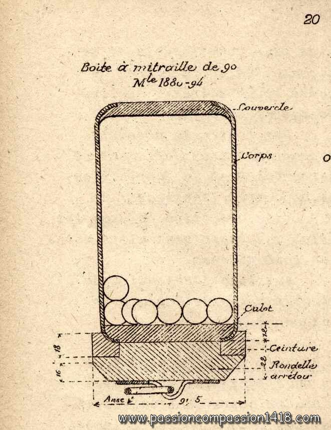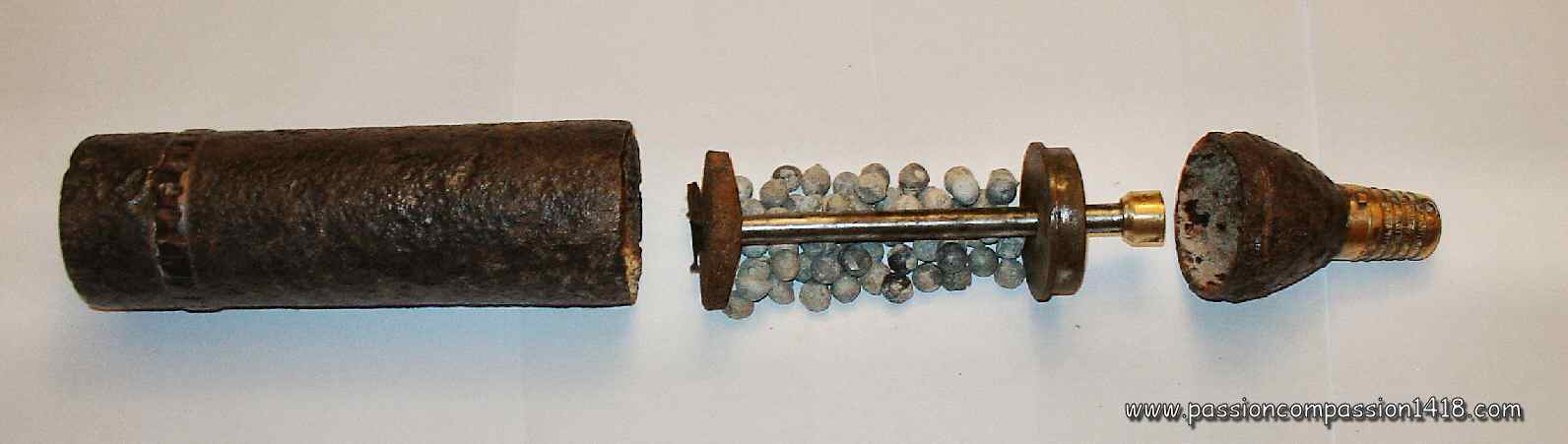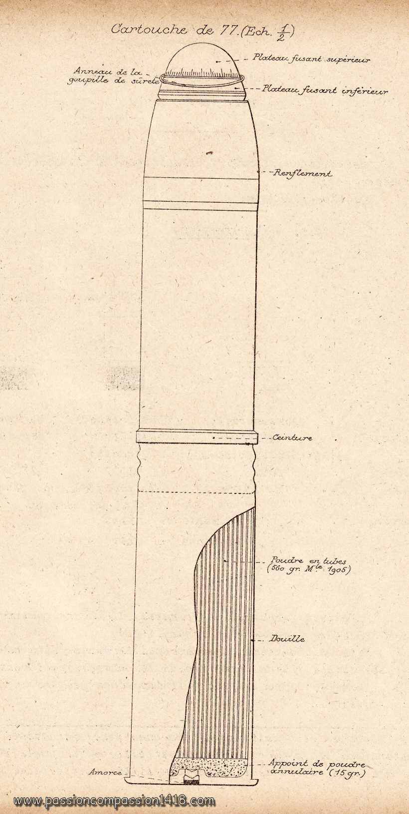 In August 1914, the shrapnel shells were the main ammunitions of the field artillery. Designed to burst right over the ennemy troops by the means of a specific time setting device (time fuze), they were spreading an deadly lead bullets and steel fragments rain while producing a smoke cloud that allowed the gunners to tune their aiming.