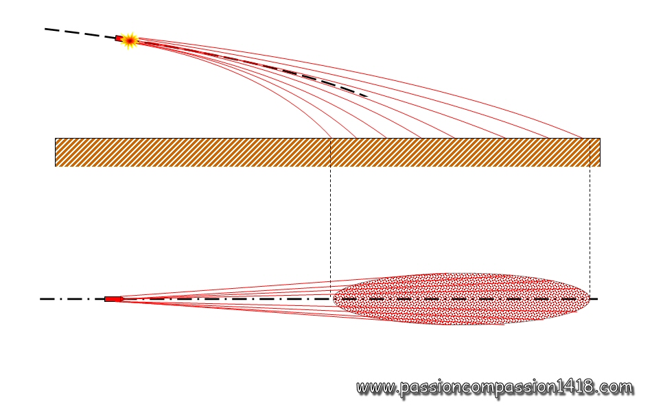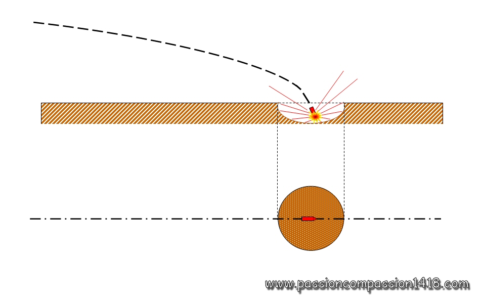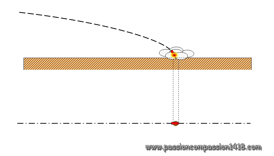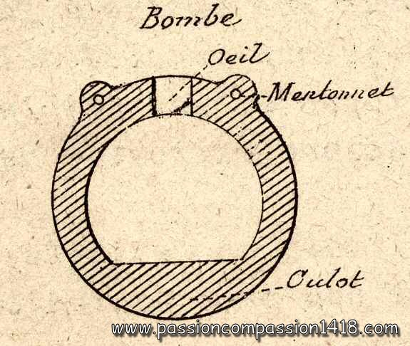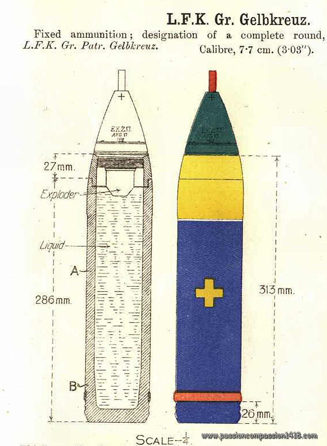 | Wartime scheme of the German 7.7cm 'Yellow cross' shell. Toxic material directly in contact with the shell walls. | Wartime scheme of the German 7.7cm 'Yellow cross' shell, with the toxic liquid contained into a glass bottle. | |