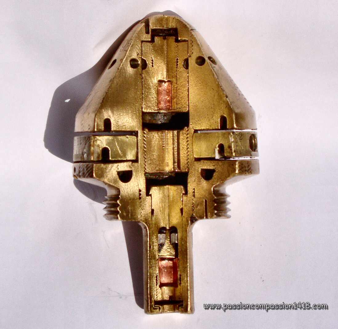 | German time and percussion fuze Dopp Z 92. The cut-through allows to observe the internals of the sophisticated mechanical and pyrotechnic system. | |