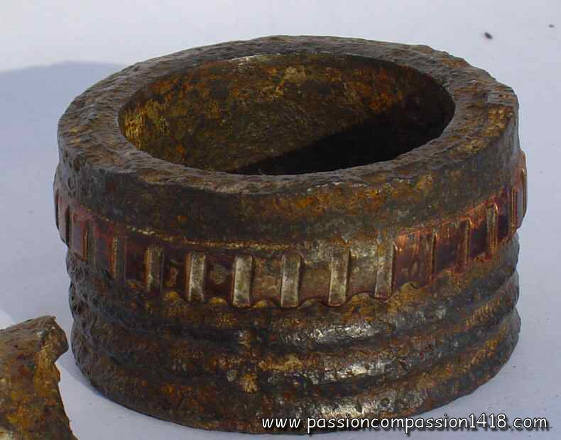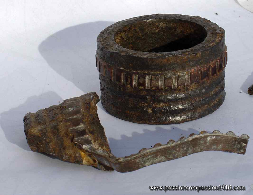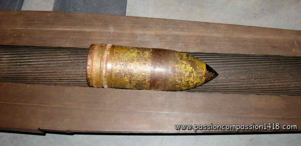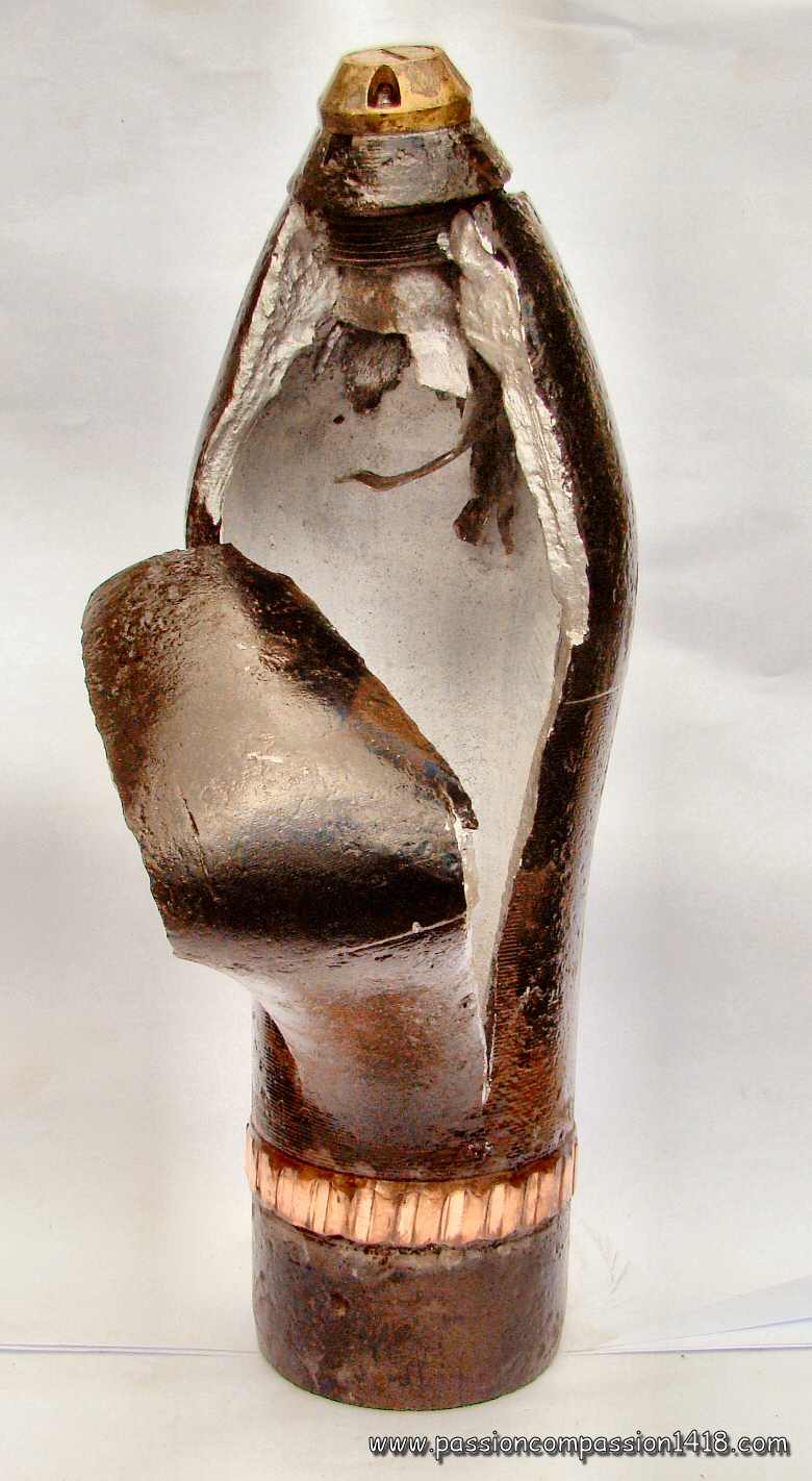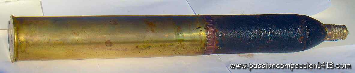 The gaz, suffocating or tear shells, were based on the same kind of design as the incendiary shells, but diepersed toxic or irritating material when hitting the ground. These shells were often made of a double envelope system : the inner envelope containing the agressive liquid could be made of glass or thin steel plate. In other designs, the toxic material was contained inside a glass bottle that was broken by the shock of landing, simultaneously with the shell casing dismantling. These shells were most often used with 'superquick' fuzes, so that the shell burst occurs over the ground. See this excellent website for an extensive presentation of the WW1 gaz war history and material : 'La Guerre des Gaz' |