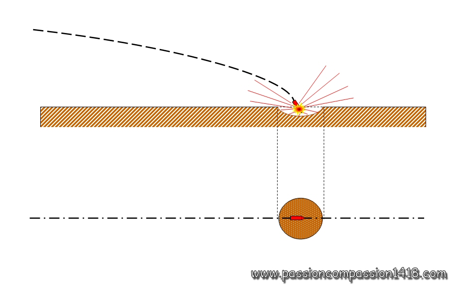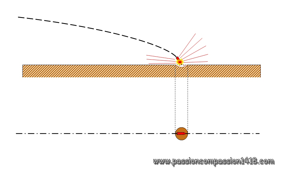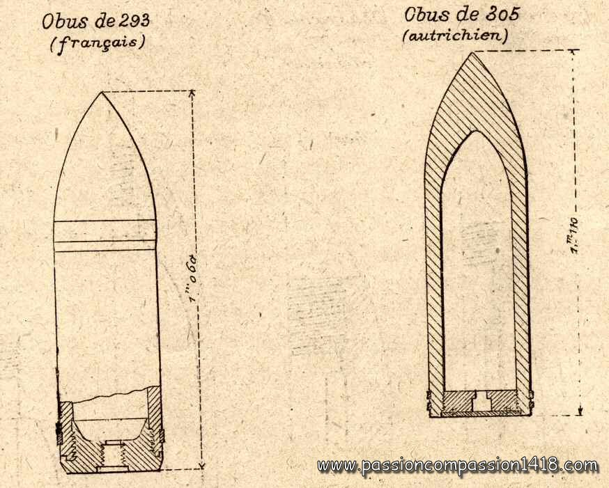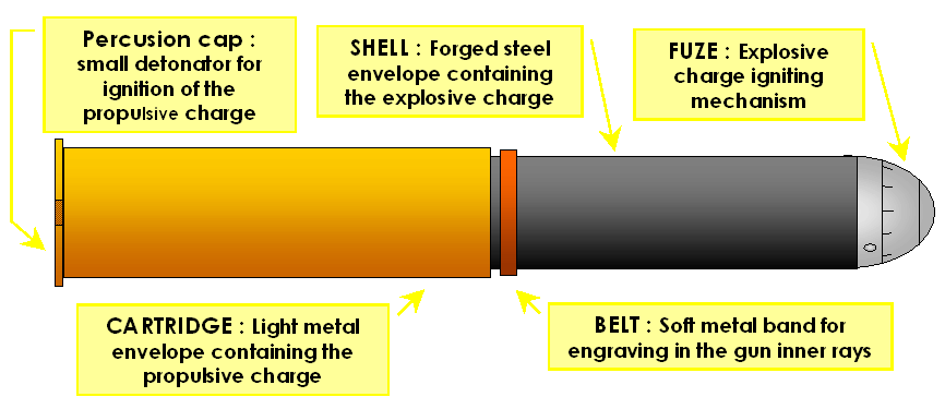 The high explosive and perforation shells have been designed in order to burst when hitting their target (but also in flight, for high explosive shells), under the action of a powerful and large quantity of inner explosive charge. Their thick steel walls were producing deadly fragments, and the charge burst a shock effect much larger than the fragmentation shells could ever do.