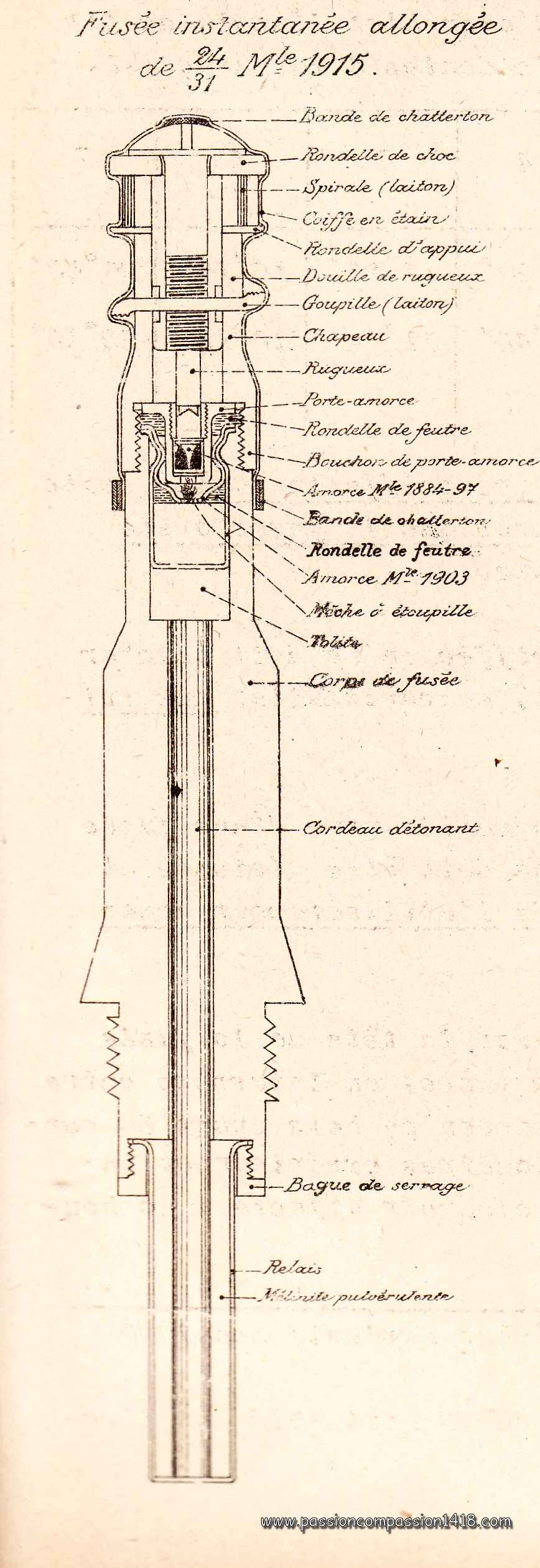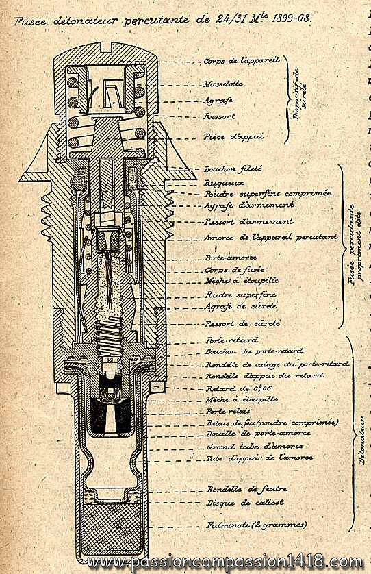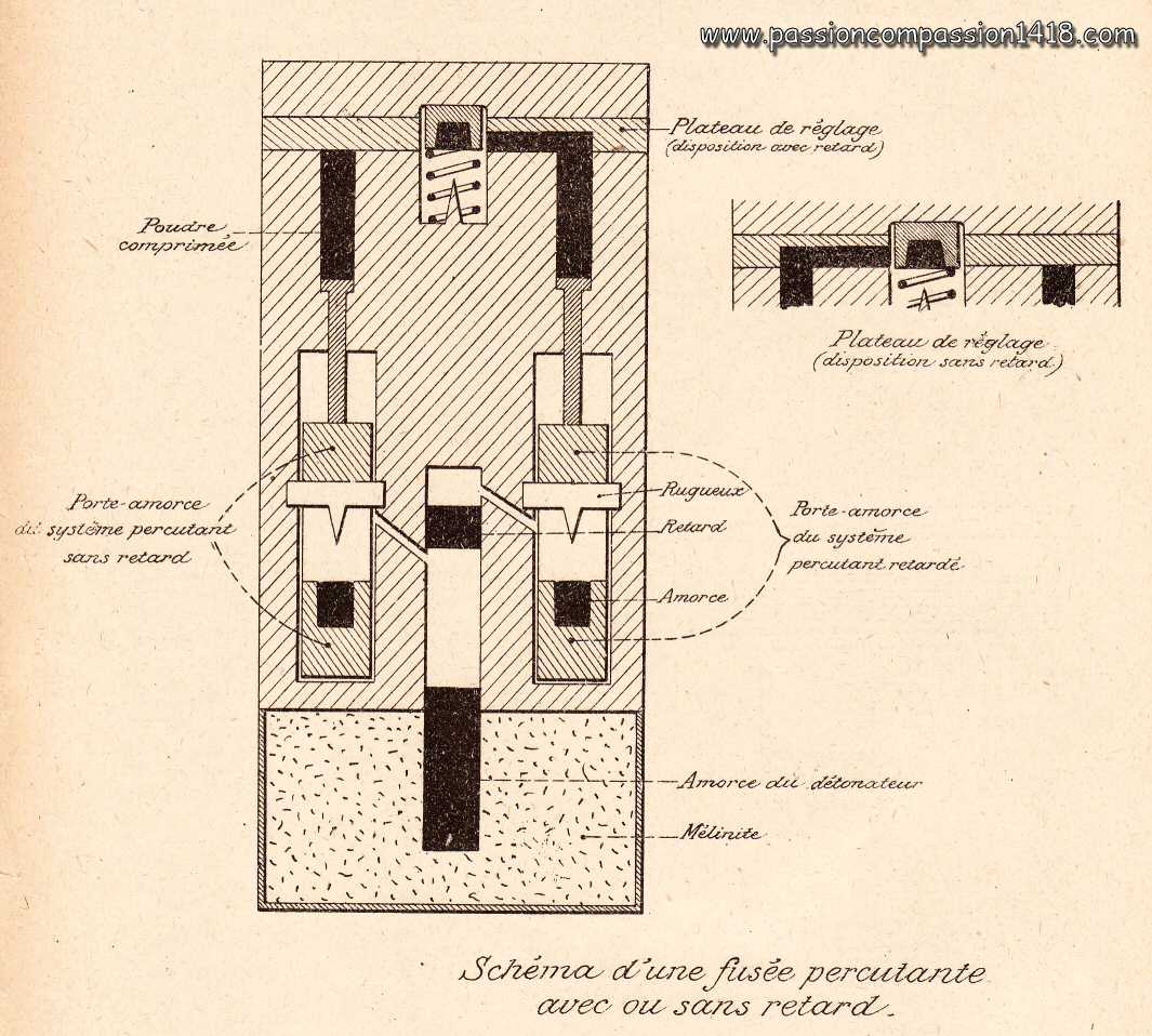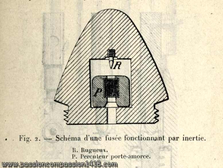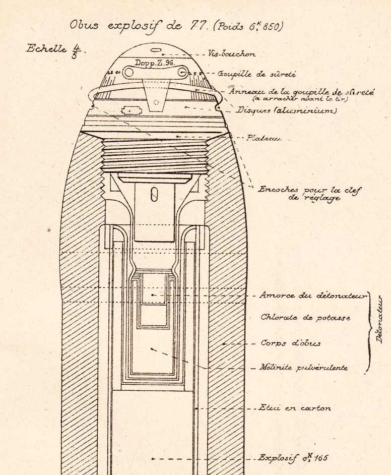 Percussion fuzes were designed to trigger the burst of the shell when hitting the ground, an obstacle or the aimed target. Originally dedicated to siege guns and projectiles, they became more and more used during the war with all guns including the fieldguns, with the progressive replacement of the classical shrapnell shell for anti-personnal missions by HE shells, inspired by the trench war experience.