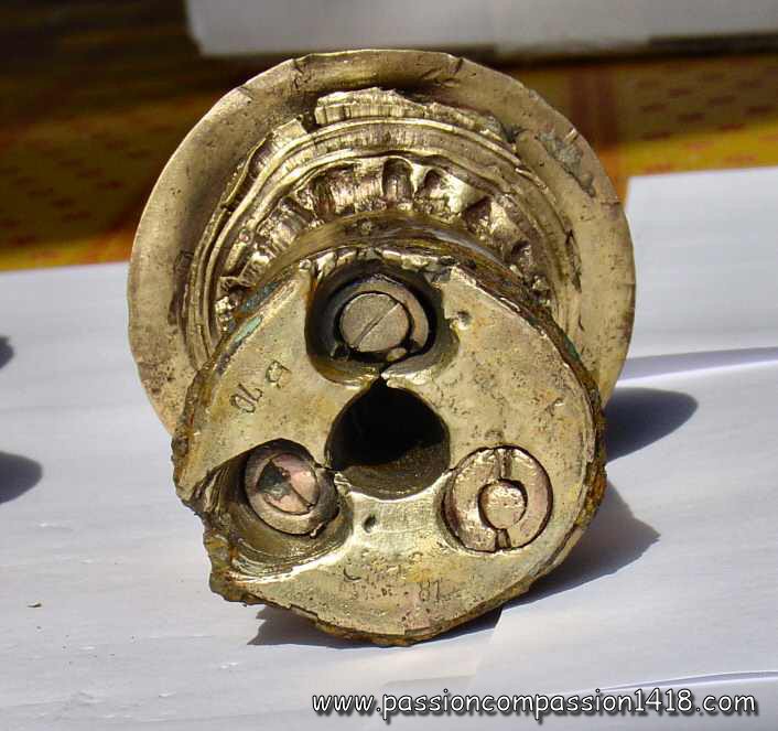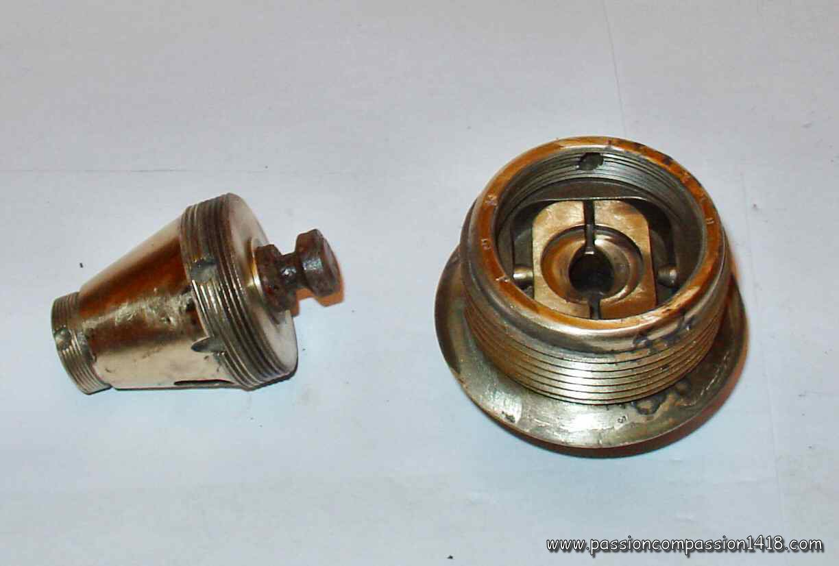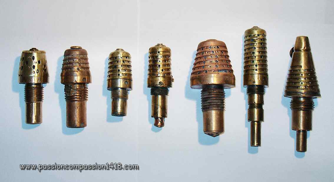 | Fusing spiral groove of a French 25/38 Mle 1880. The lead inner barrel has been pierced at the place of a graduated cap hole | Family picture of several French fuzes derivated from the French Time System, including some pre-WW2 fuzes. | Fusing spiral groove of a 30/55 Mle 1884 French fuze |