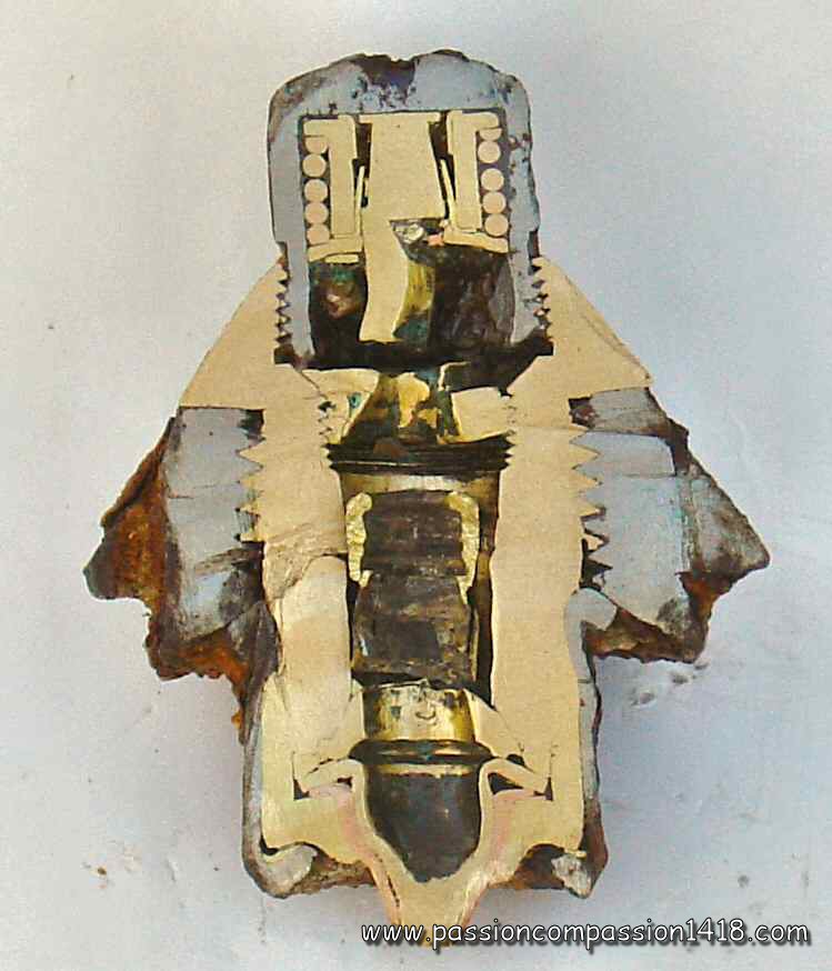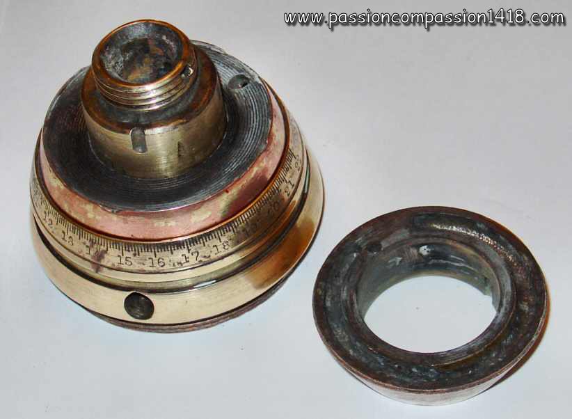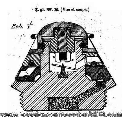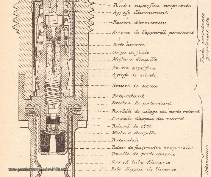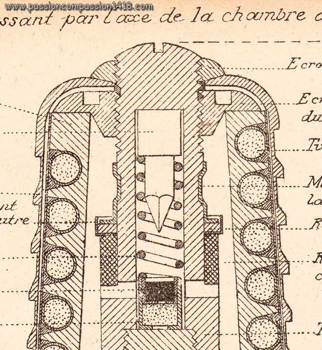 The wartime scheme at far left shows that fuze, using a Robin arming system for the percussion system in the tail and another kind of stirrup system in the top head mechanism ('Lejay' type) for an additional safety. The picture at left shows the remains of such a fuze that can be easily comparred with the scheme.