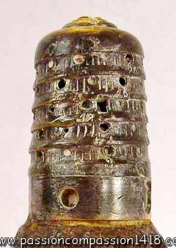 This kind of time fuze was exclusively used by the French artillery, for instance with their famous fuzes '22/31 mod. 1897' (whose wartime scheme is shown at left, and a surviving example at right), or the '30/55 mod.1889'. The following explanation is made for the first model, that was equiped of an additional classic percussion fuze device in its tail. This particular fuze thus was a 'double-effect' (or 'time and percussion') one. |