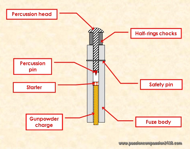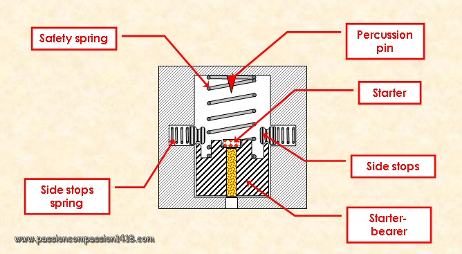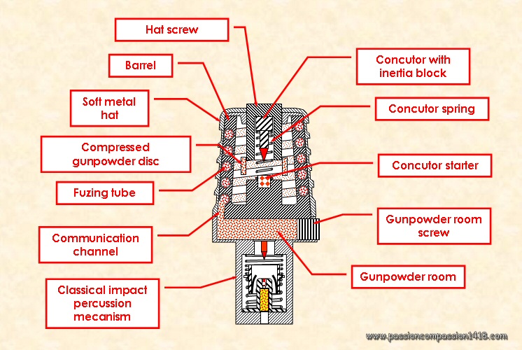 This system was able to block either a percussion system graze pellet movements, or the percussion rod of super-quick percussion fuzes, such as this GRZ16 and this GRZ17 fuzes