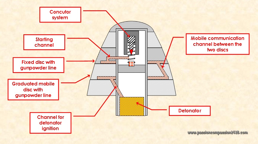 Wartime scheme of the KZ14 German percussion fuze, using the pyrotechnic safety system. One can see the system housed on the top of the fuze in two cylinders, one with the concutor, the other one with the compressed gunpowder grain and the stem, as well as the fume vent.