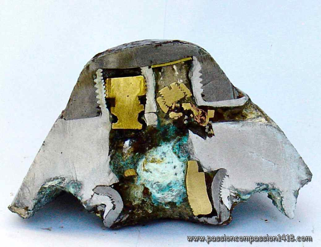 Section of the same fuze, showing the same mechanisms damaged by the explosion.