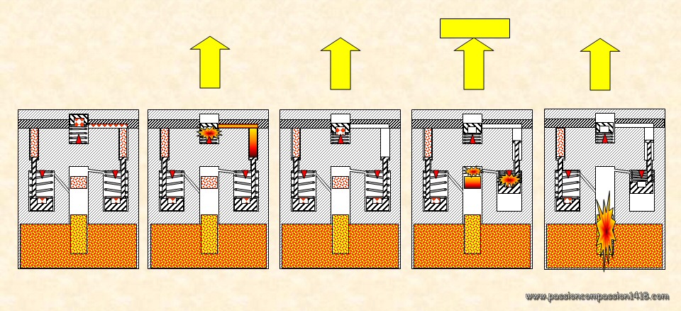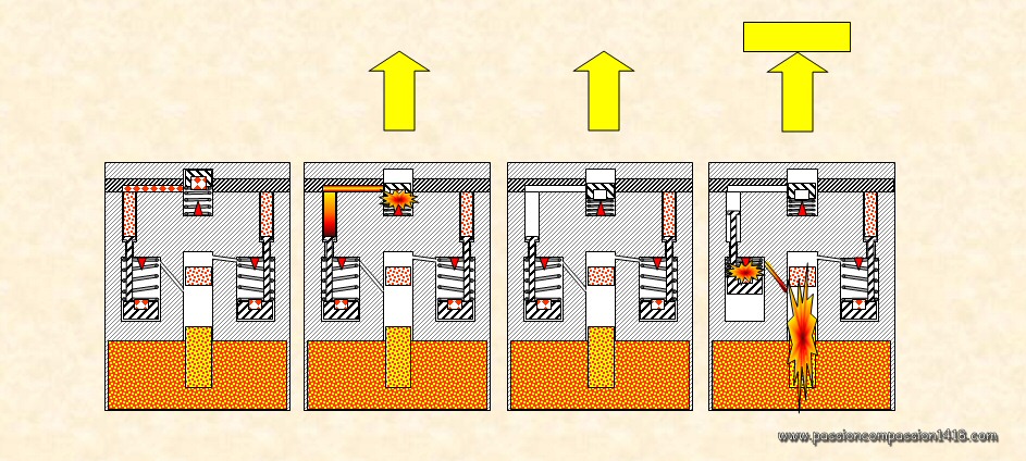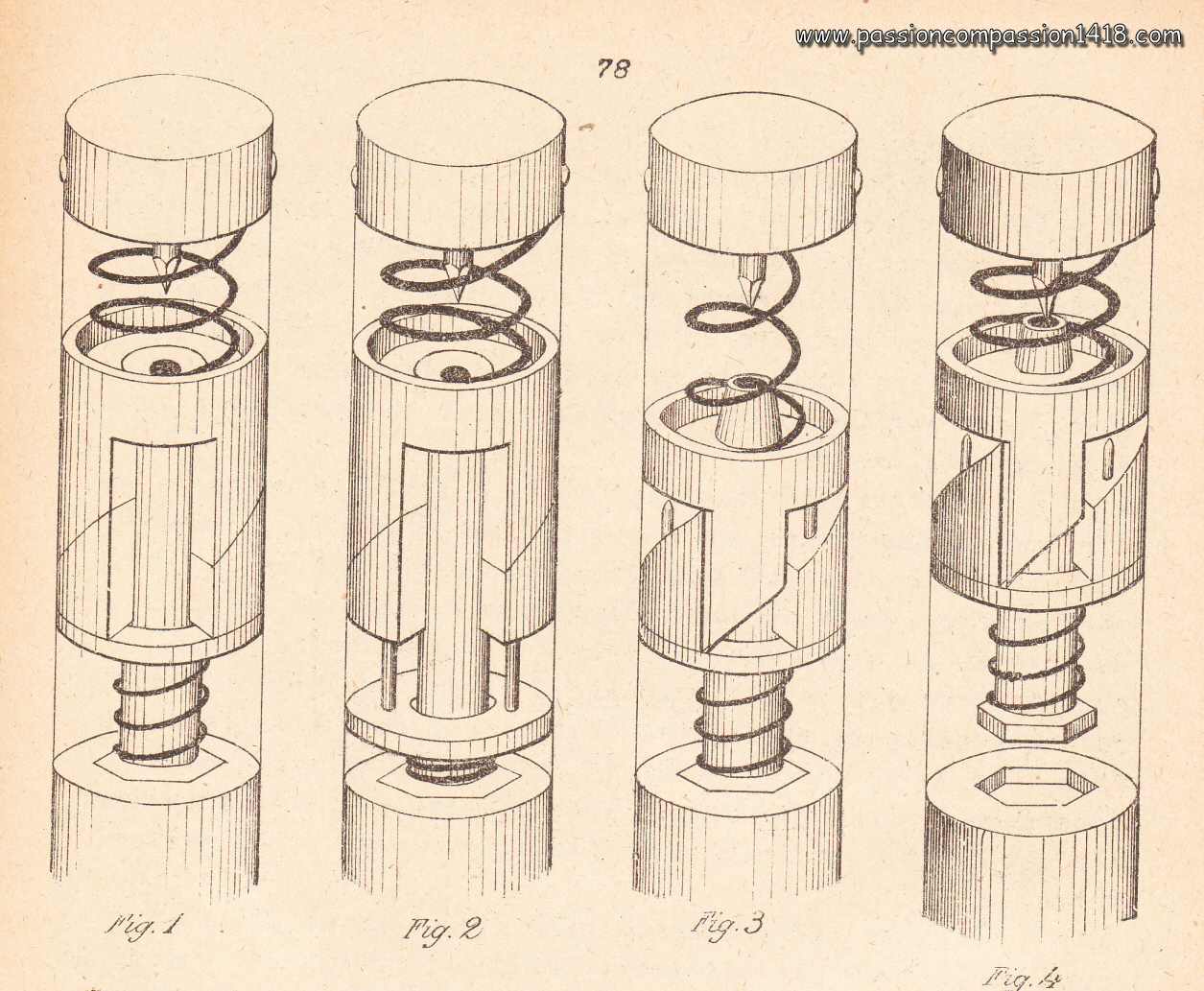 In this system first implemented in 1914 in the fuze 24/31 Mle 1914, and later in the mine-throwers fuze 24/31 Mod 1916, the accidental meeting of the percussion pin and the detonator cap was prevented by an intermediate cylinder that could shorten itself thanks to an ingenieus system of helicoïdal ramps.