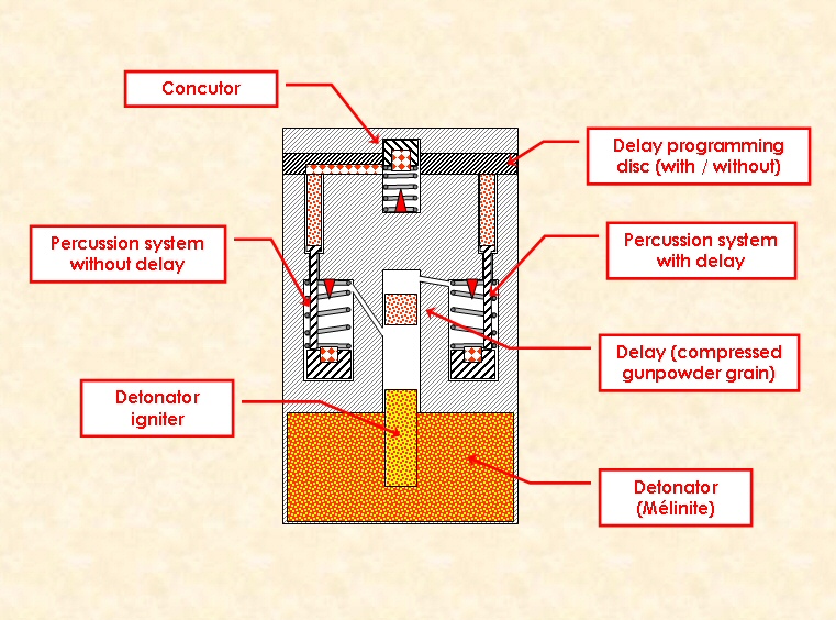 | Whereas French and British fuzes were most of the time originally built with or withour delay, or could be quickly adapted by inserting a delay into the tail, the German engineers wanted to create polyvalent fuzes with selectable delays. This behavior was obtained either by the use of :