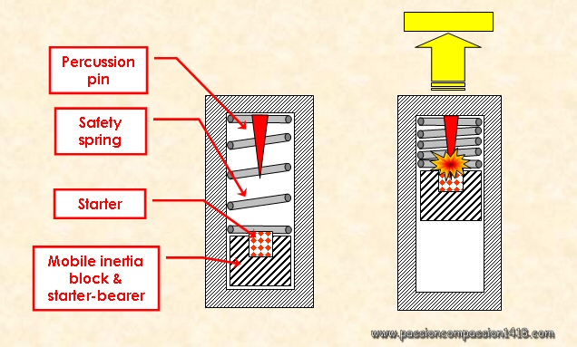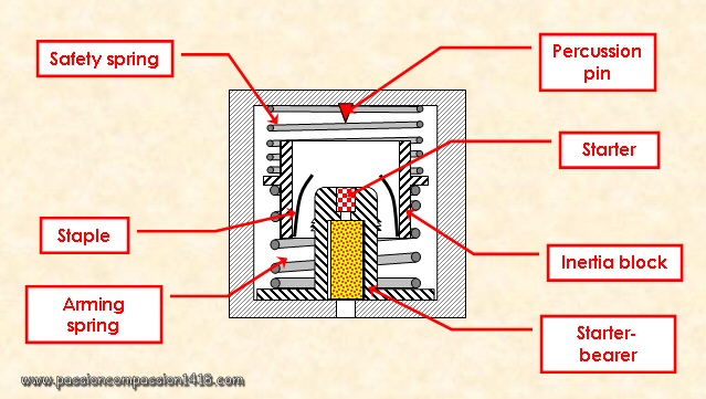 Fuzes were (and still are...) dangerous pieces of equipment, designed to create a flame, an explosion or even a detonation on a shock or when ignited. Safety devices were necessary to ensure they would not act this way elsewhere than in enemy territory, just when they were wanted to do so. Springs and pins : the basic arming devices Stirrups and ramps : inertia arming systems : Pyrotechnic arming system Centrifugal force arming system The centrifugal force effects were used in numerous fuzes or detonators safety devices, using different principles, as seen in the following examples :