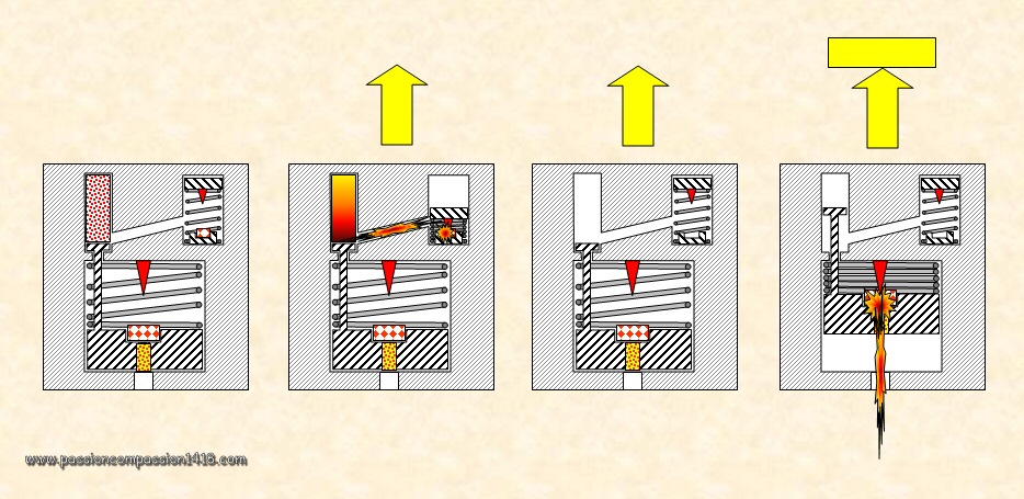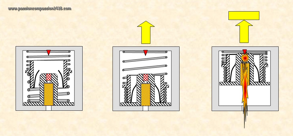 In these devices, the combustion of compressed gunpowder grains ignited at shot departure was needed to allow the action of springs opening metallic jaws that were blocking the movements of the main percussion system at rest.