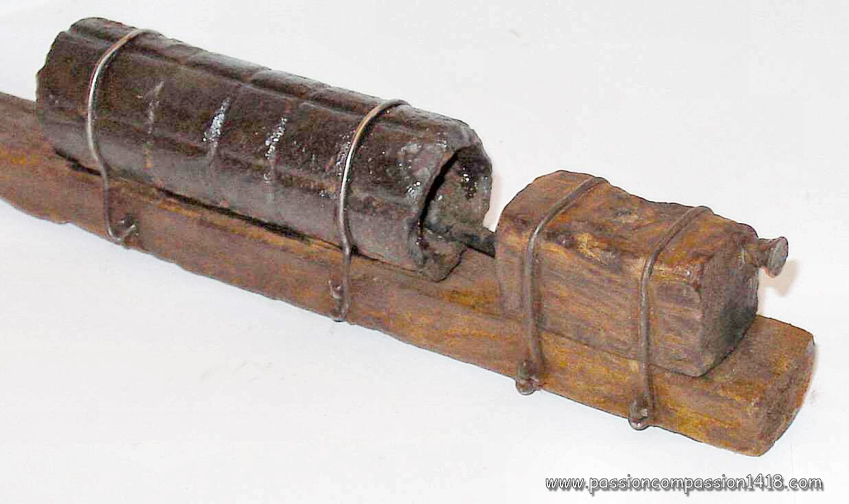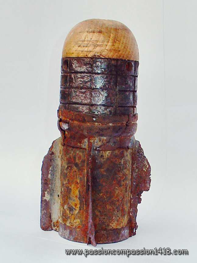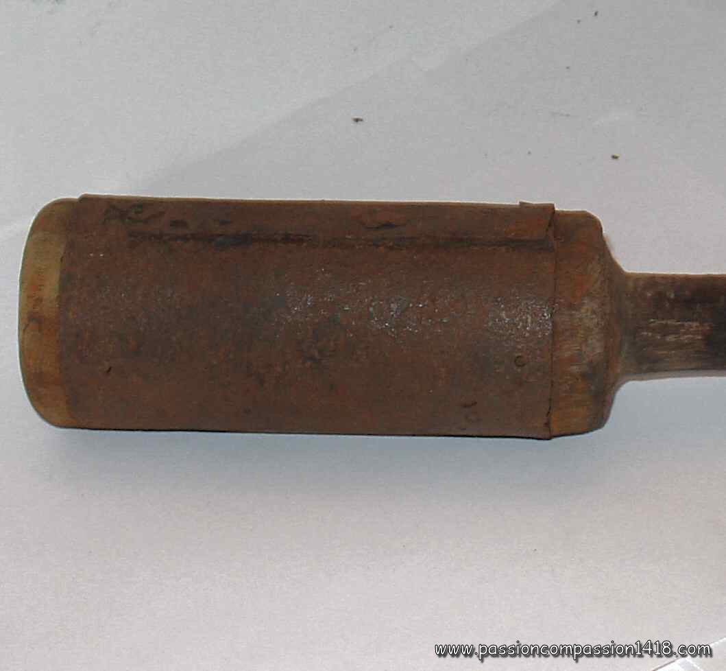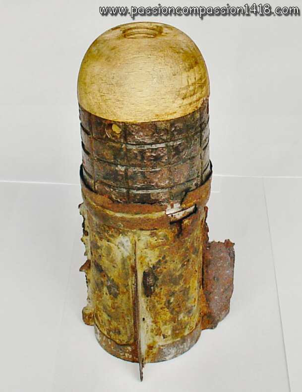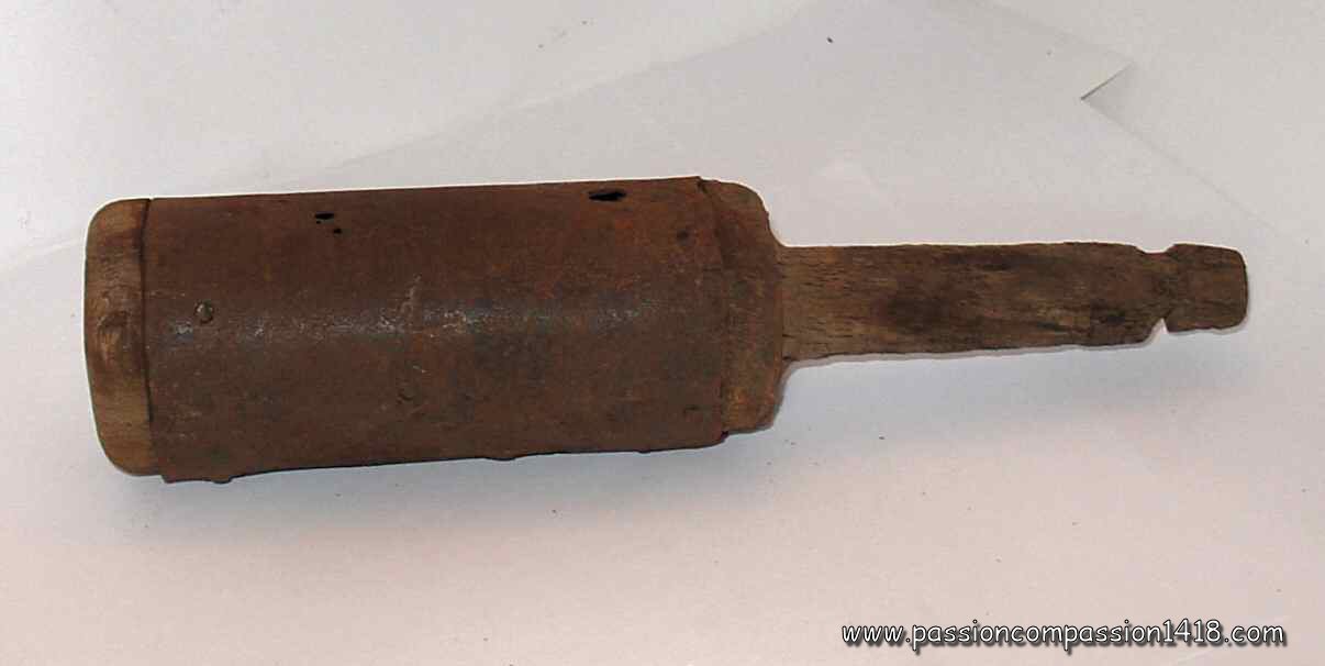 IIIrd army grenade - detail on the wooden block with the percussion nail on the top and the nick getting inside the cylinder |
