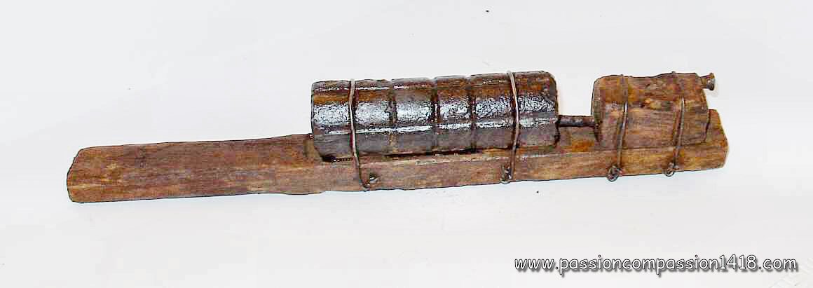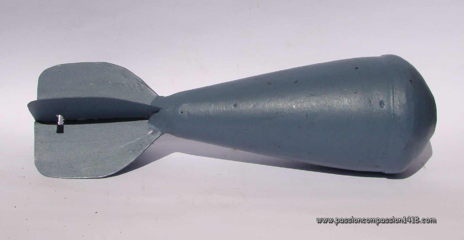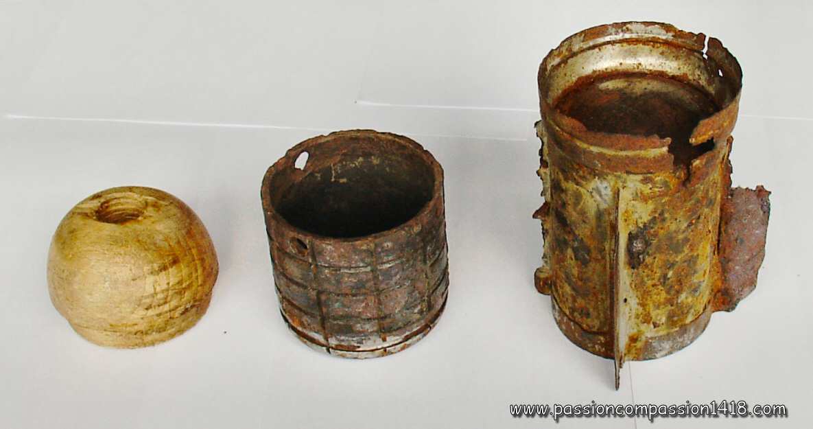 Having quite a primitive conception, it is simply a cylinder made with a rolled anb riveted steel plate, plugged at the top with a wooden block, and at the base with a wooden stick . This stick was hollow, making place for a traction igniter setting fire to a powder line cord (representing a 5 seconds delay), linked to the detonators. Those latter cause the explosion of the 400 gr of Cheddite charge, confined in the steel cylinder.