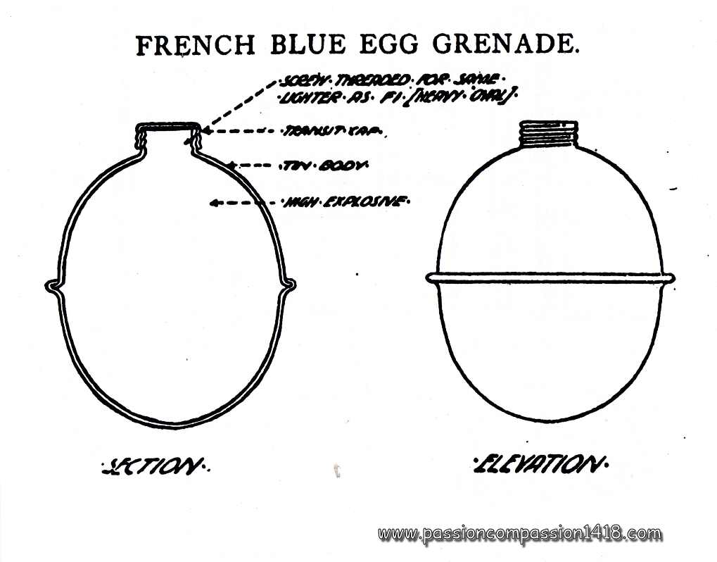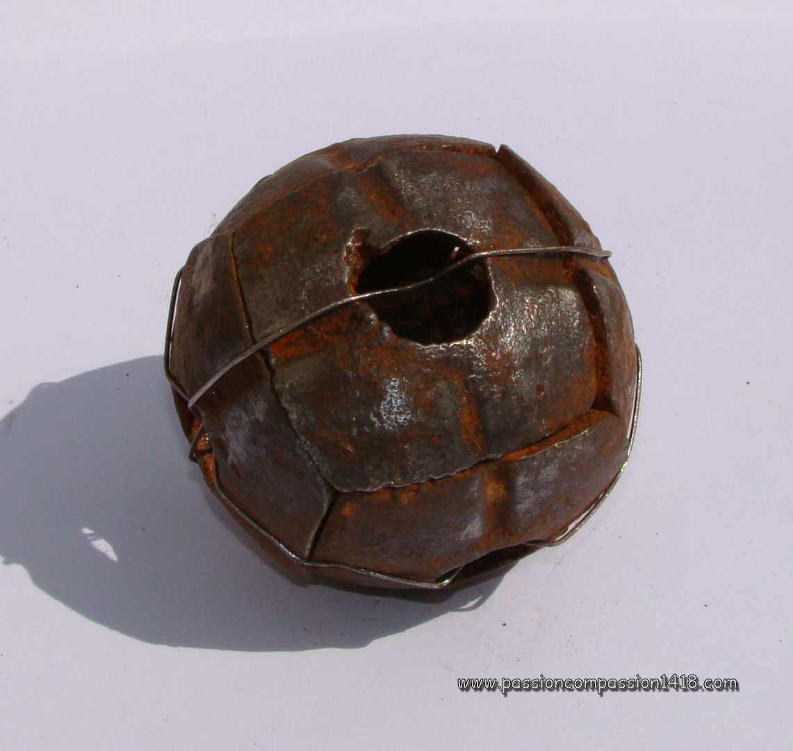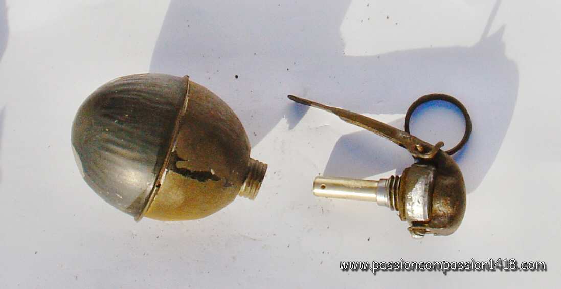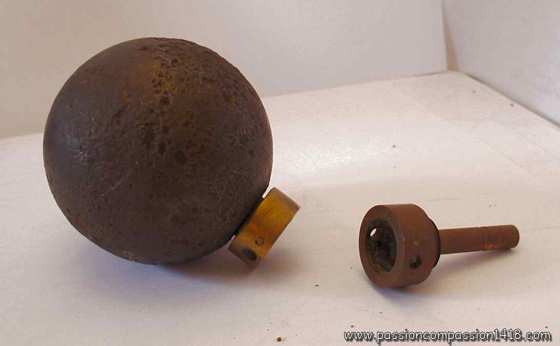 The assembly of this sphere designed centuries ago and modernized for the last time 67 years ago, with a antique fuze whose last improvement had been made about 30 years ago, formed the only official grenade at the disposal of the French soldiers in 1914 : the grenade modèle 1847.