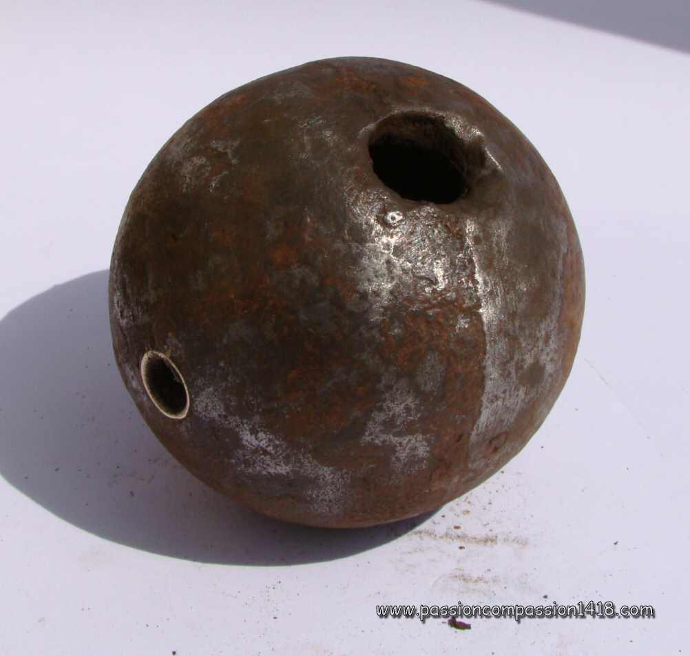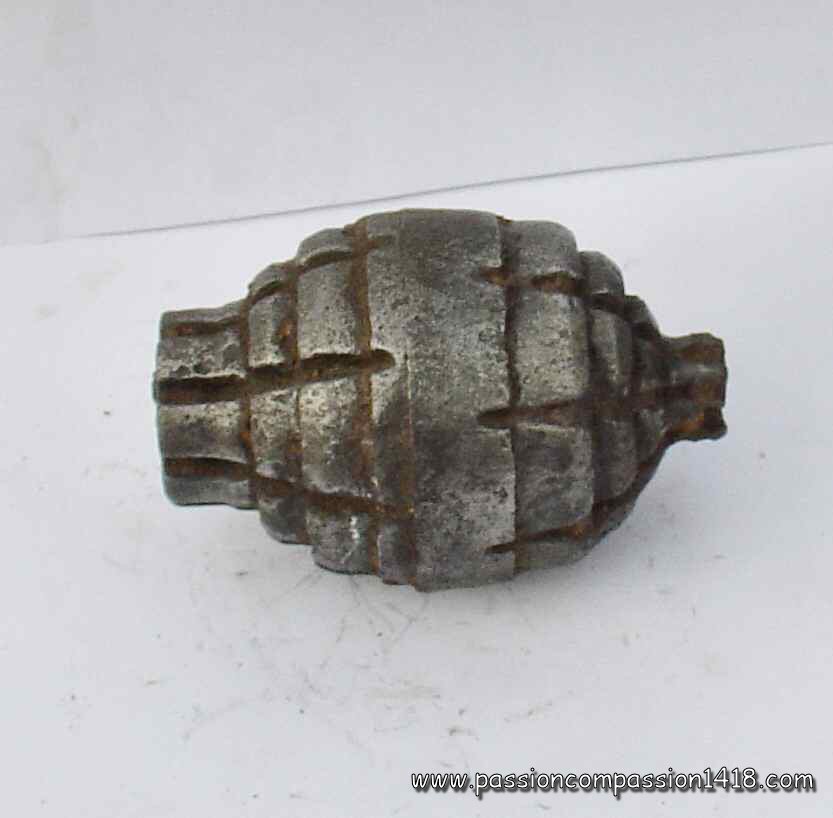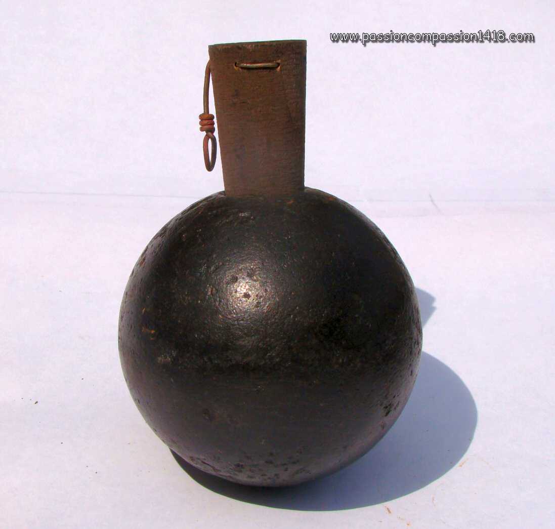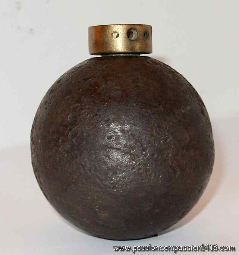 Almost as old as the invention of the black powder, the grenade was stantardized in France by Gribeauval in 1777 under the shape of a 9.5 cm diameter pig iron hollow sphere drilled with a smooth hole for the insertion of a wood plug with a wick inside ('fuze').