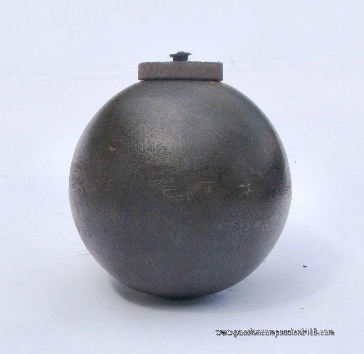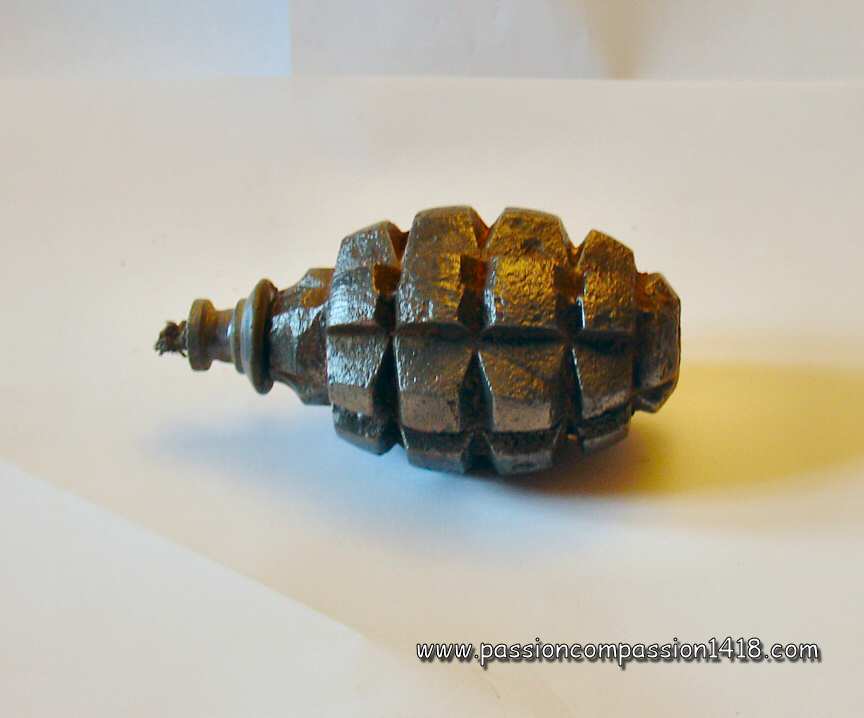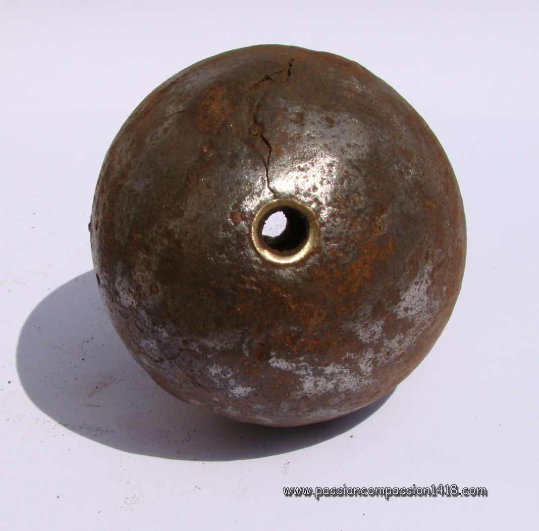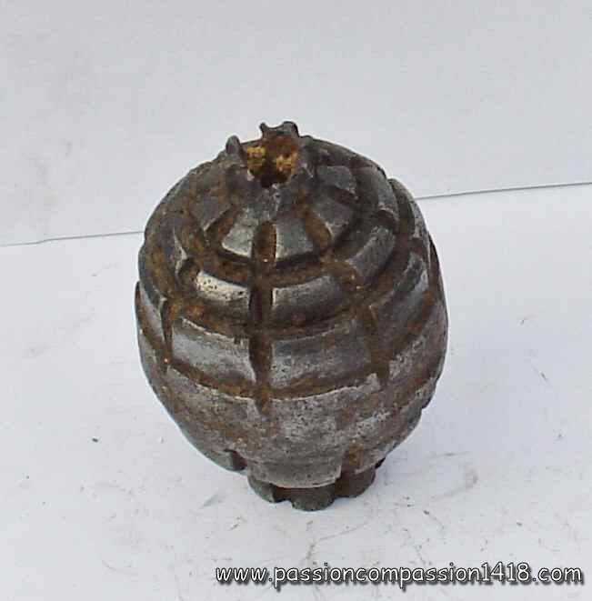 Almost as old as the invention of the black powder, the grenade was stantardized in France by Gribeauval in 1777 under the shape of a 9.5 cm diameter pig iron hollow sphere drilled with a smooth hole for the insertion of a wood plug with a wick inside ('fuze').
