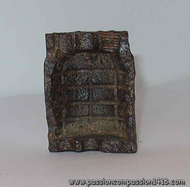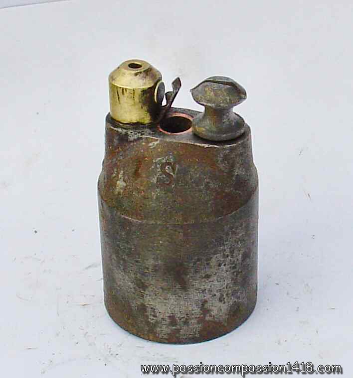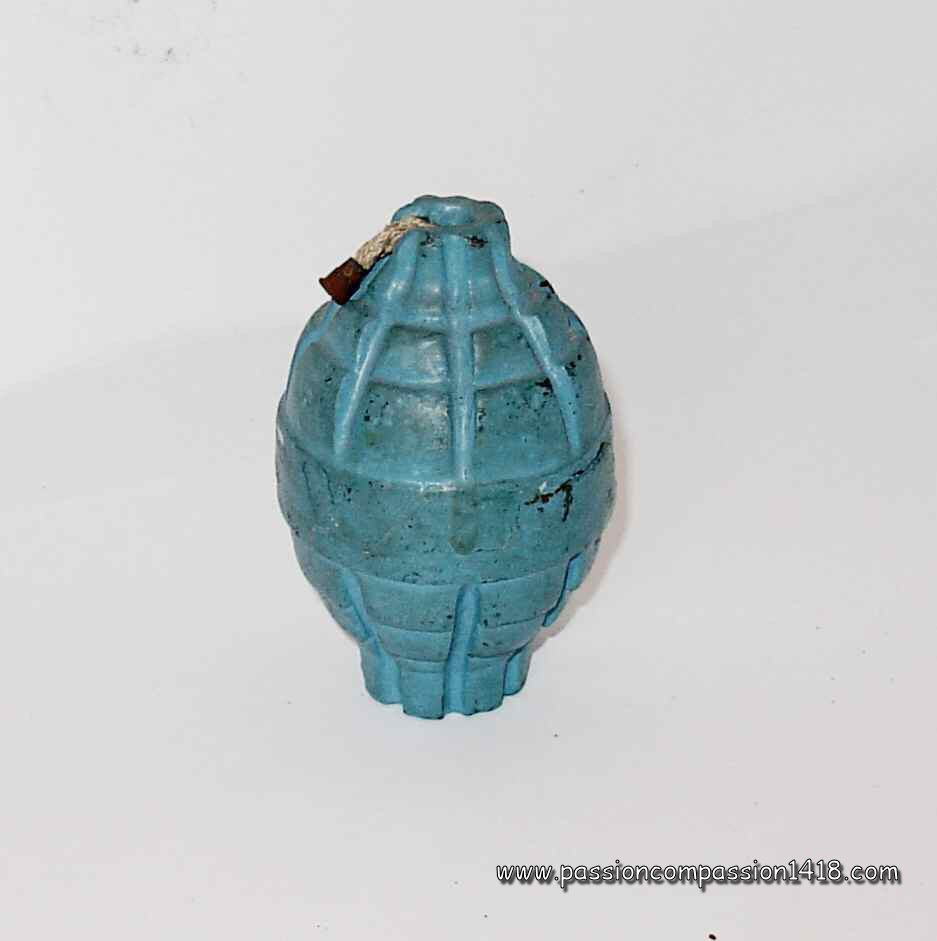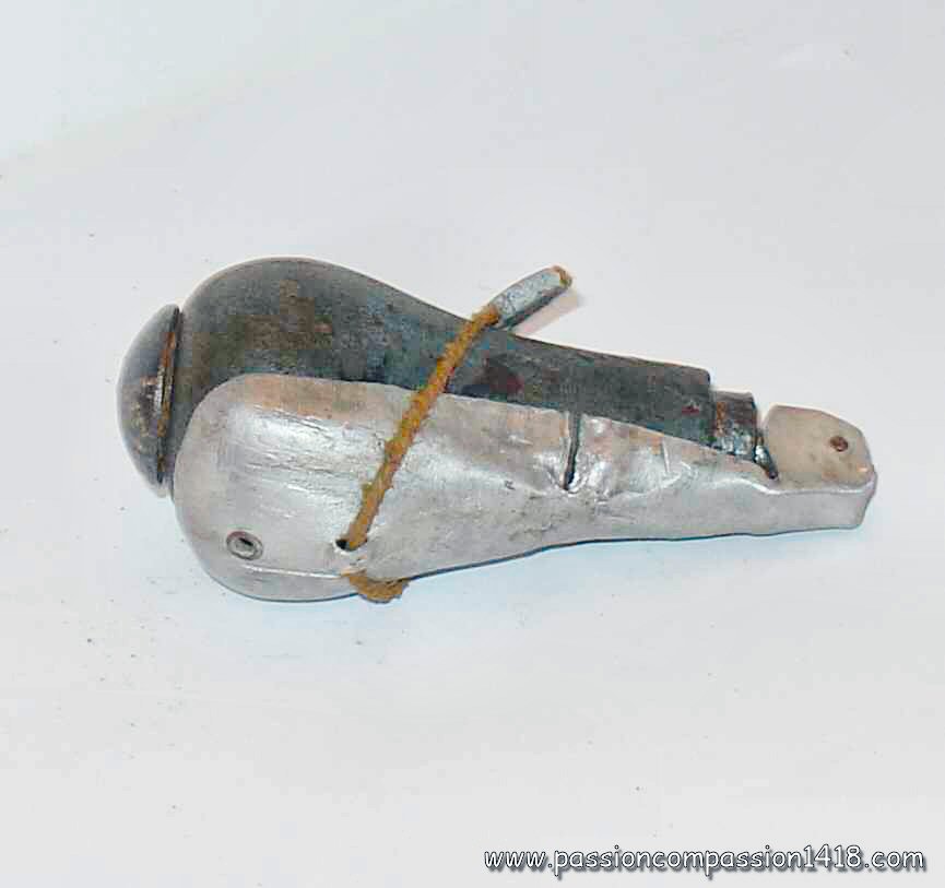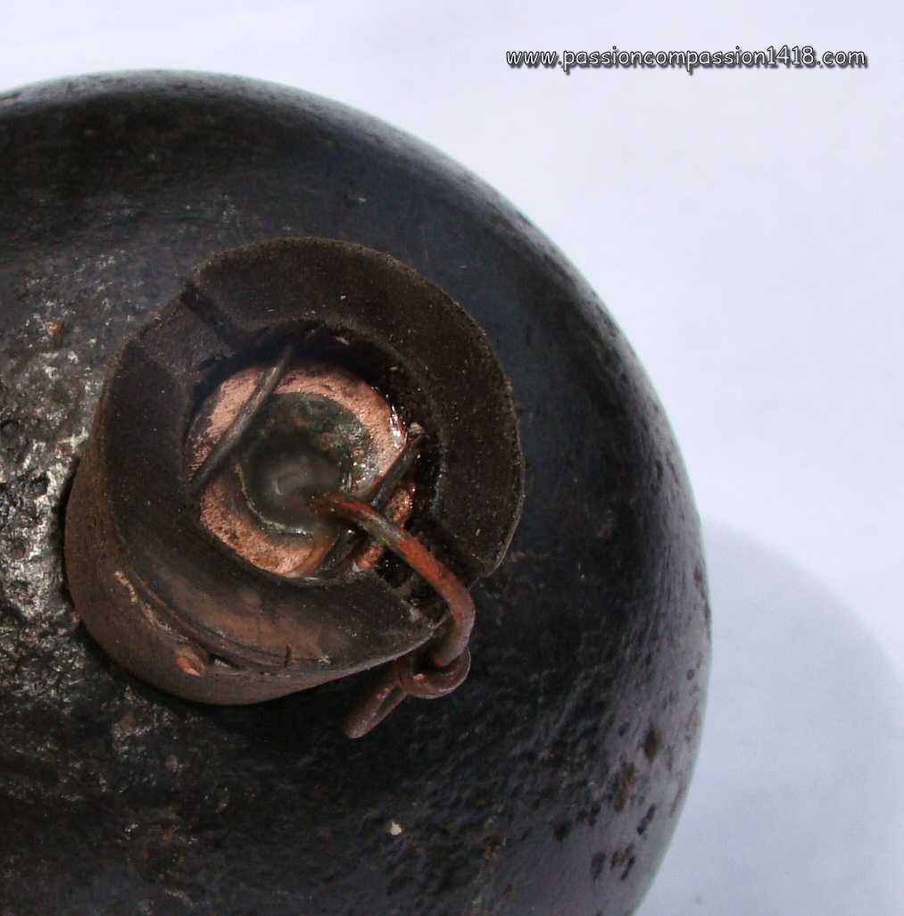 Realized by mounting of two pig iron moulded hemispheres, Réalisée par montage de deux calottes en fonte, it seems that the models made in France had a side throat for the exit of the wick, while the wick exited perpendicular to the surface for the models imported from Italy. Once assembled, the grenades were dipped into paraffine for waterproofing.