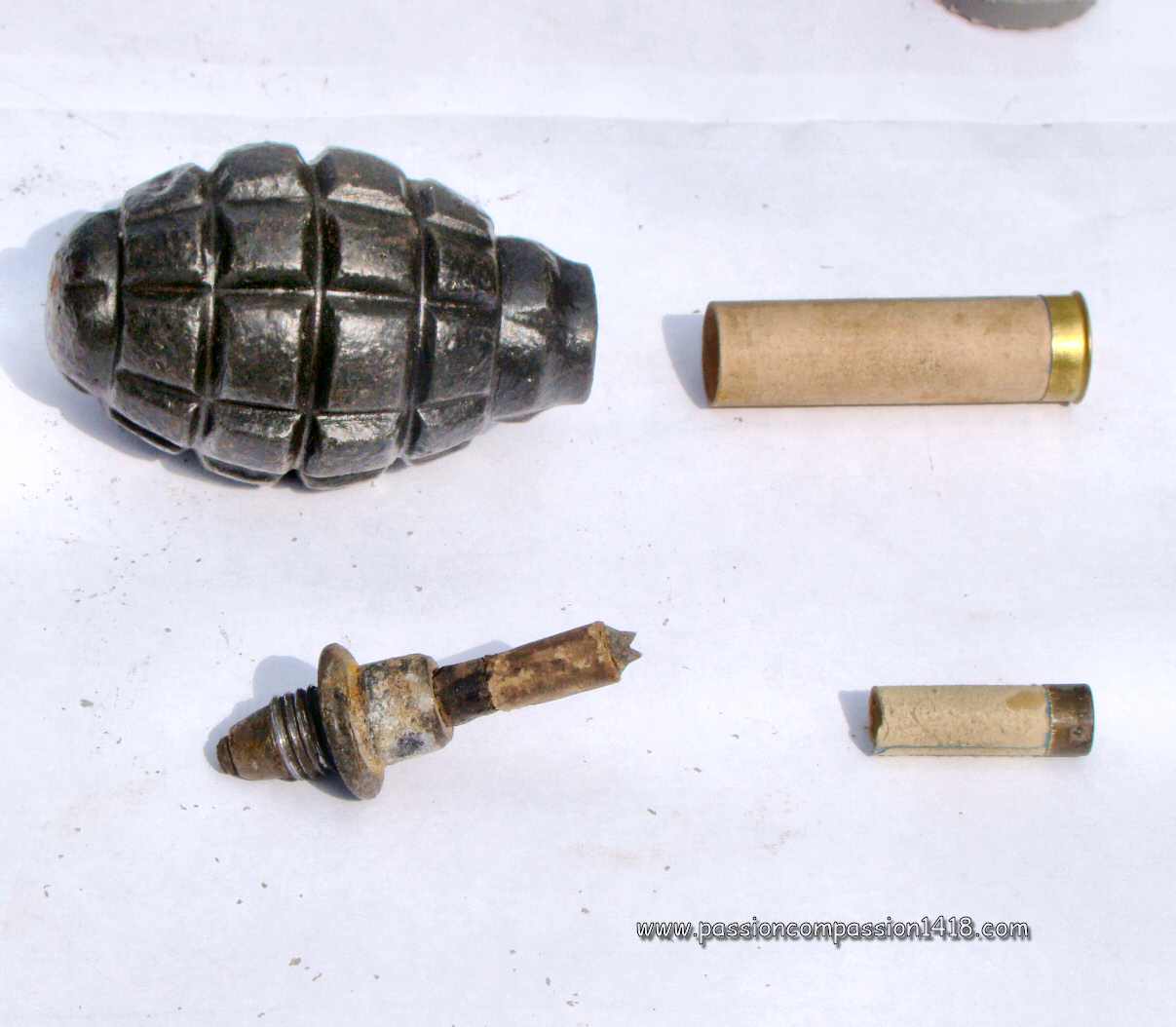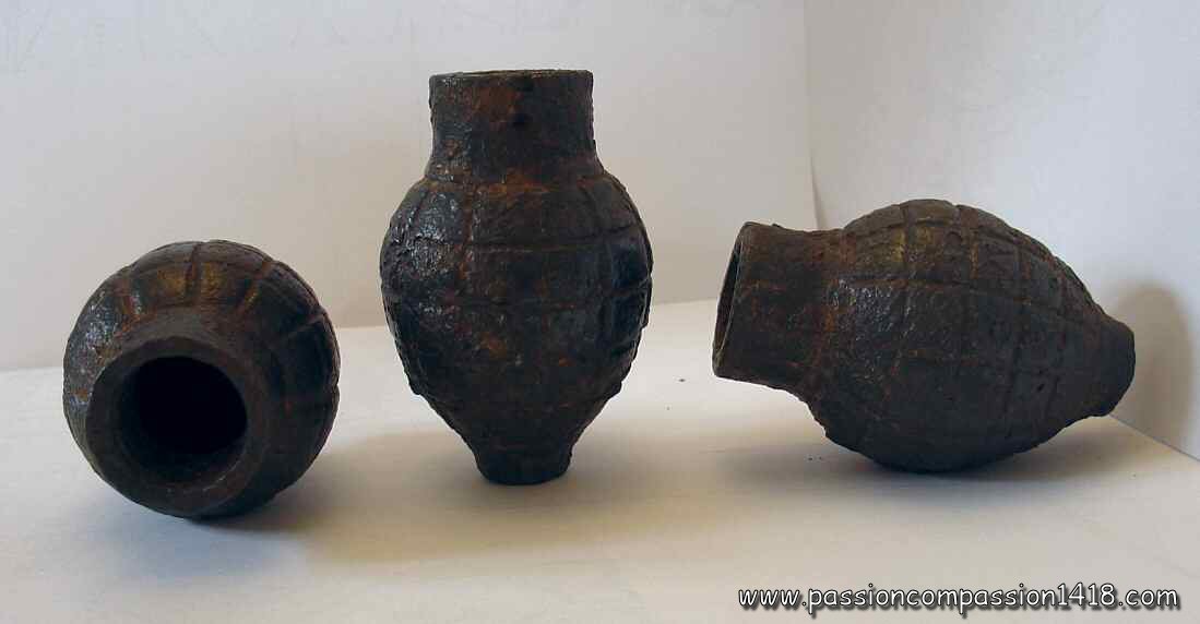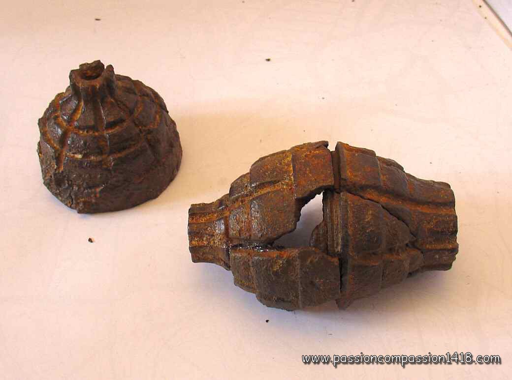 Spoon grenades re-built from their fragments, proof of the highly perfectible fragmentation properties ! (Observed in Verdun - Hill 304, and Chemin des Dames) |