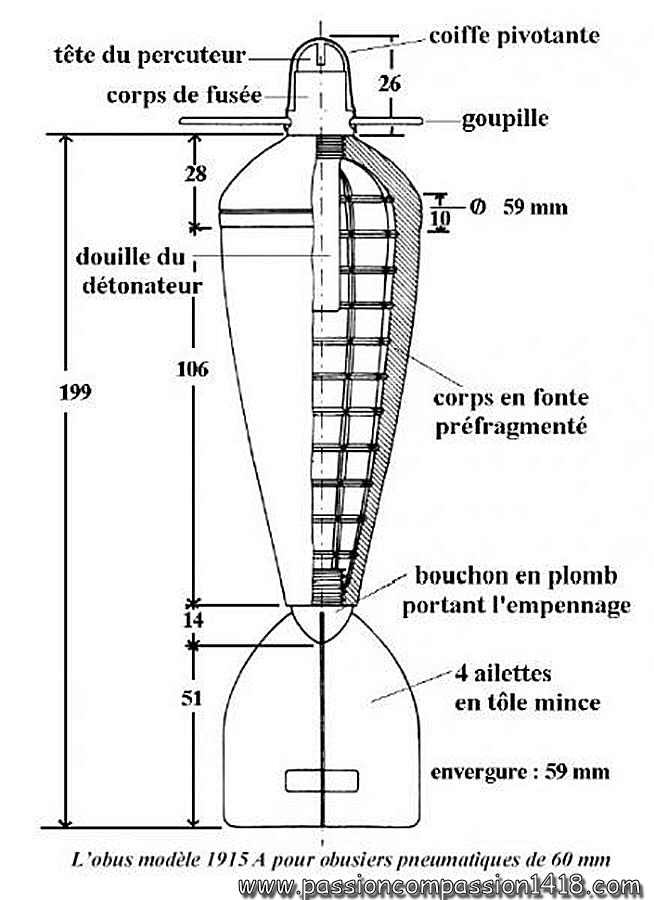 Initially developped as a pneumatic grenade-launcher, this mortar eventually received specific projectiles, with a small winged tail screwed at the bottom of the cone. There were the 60 mm explosive projectiles A shell 1915 (950 g) and B shell 1916 (650 g), with inner prefragmentation grooves and a percussion fuze with safety pin.