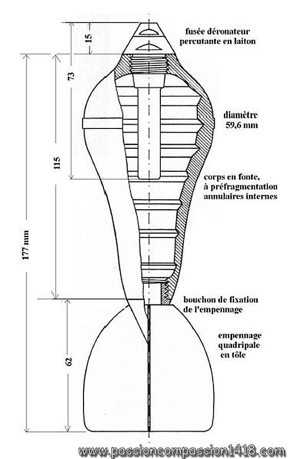 Made of a pig iron cylinder with inner fragmentation grooves, it was axially crossed by a hollow tube of the same inner diameter than the Lebel rifle bullet, laterally by an other tube containing the detonator and parallel to the central one, and was topped by a brass cap with a small lateral percussion lever over the detonator tube as well as filling aperture plug.