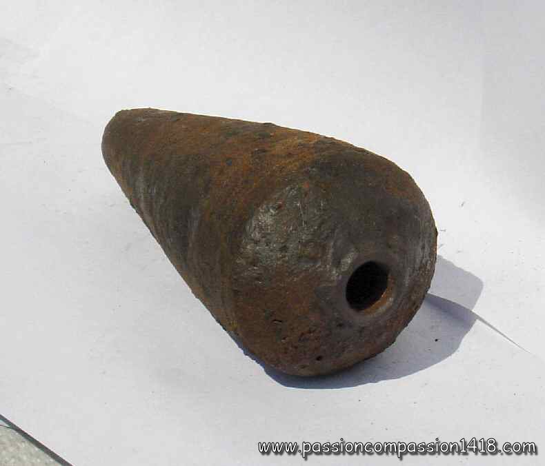 Brandt mortar 1915 A projectile observed in Champagne. The wings have disappeared. |