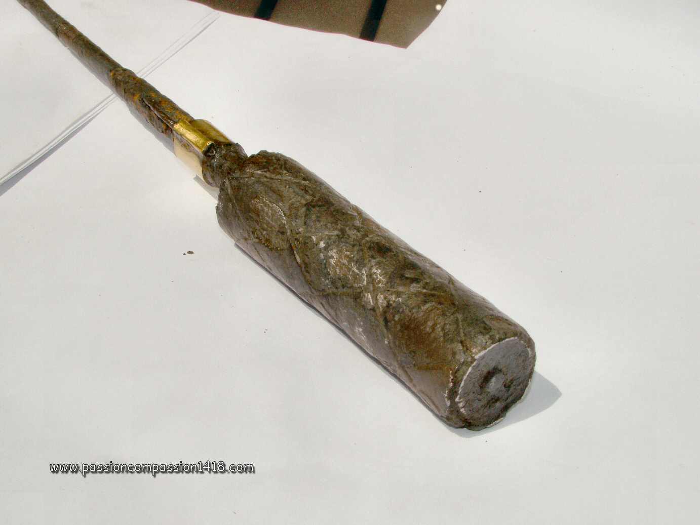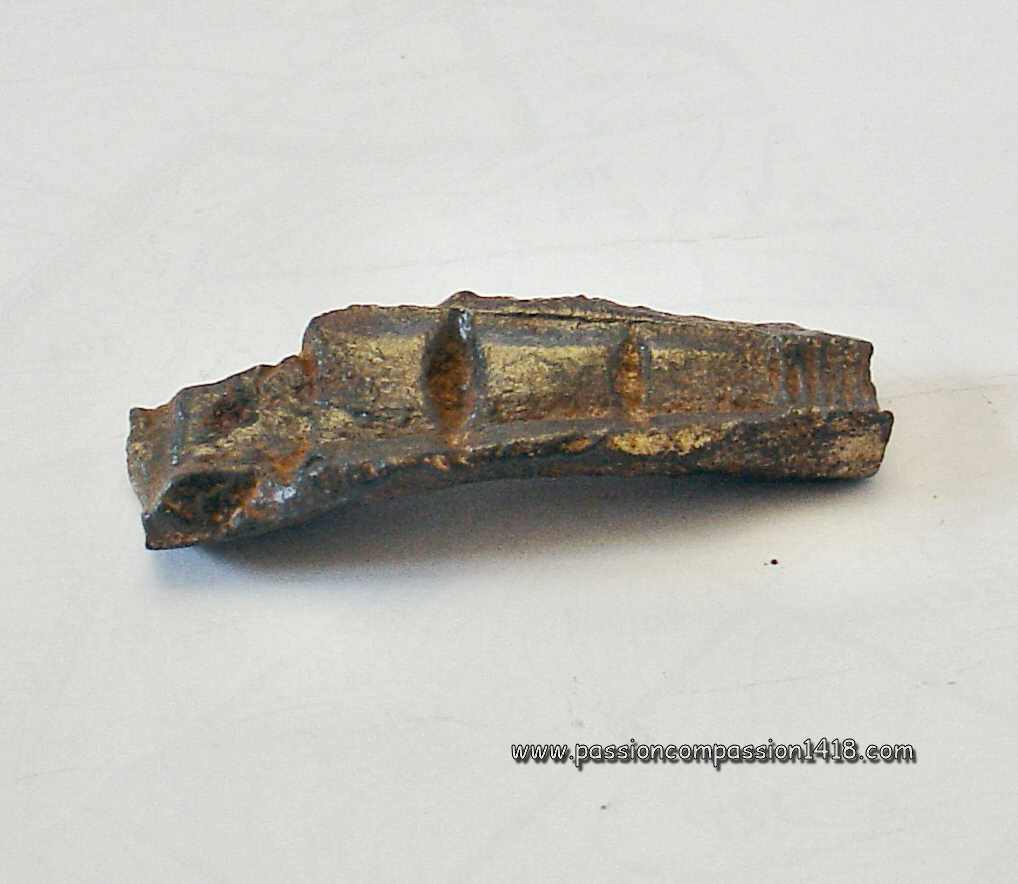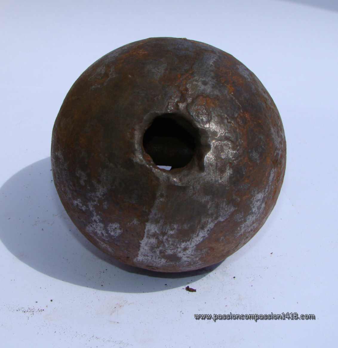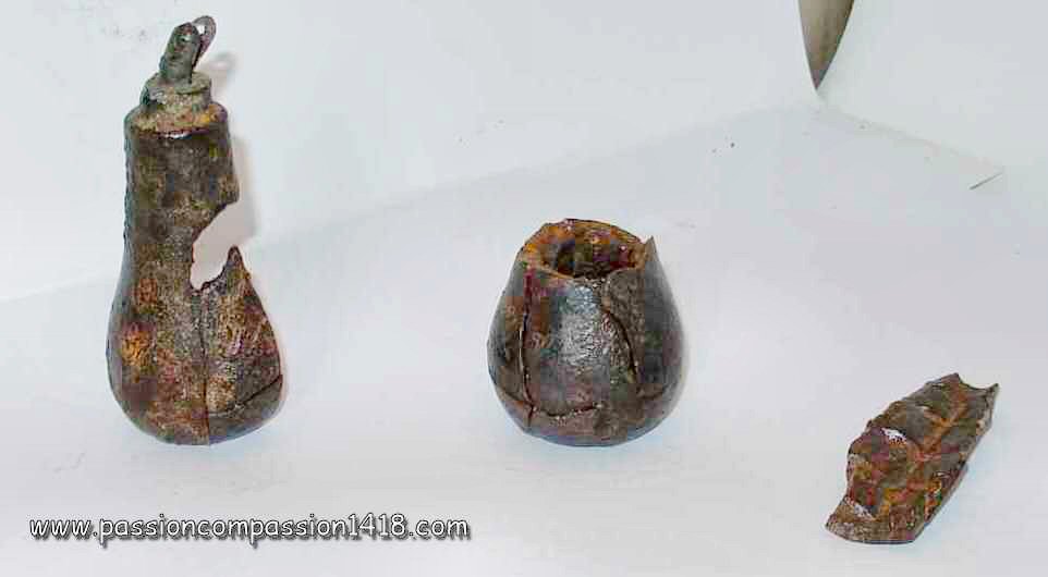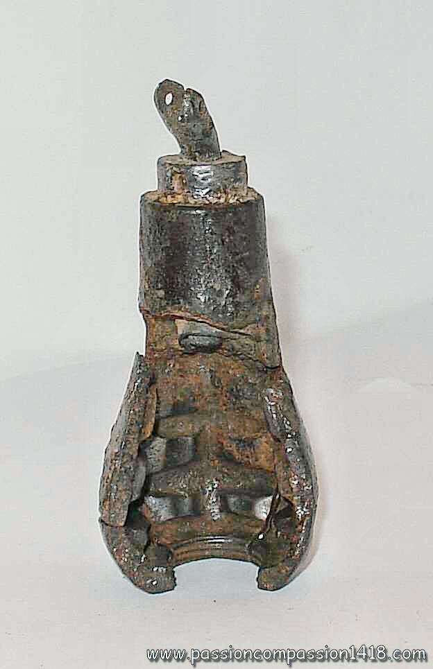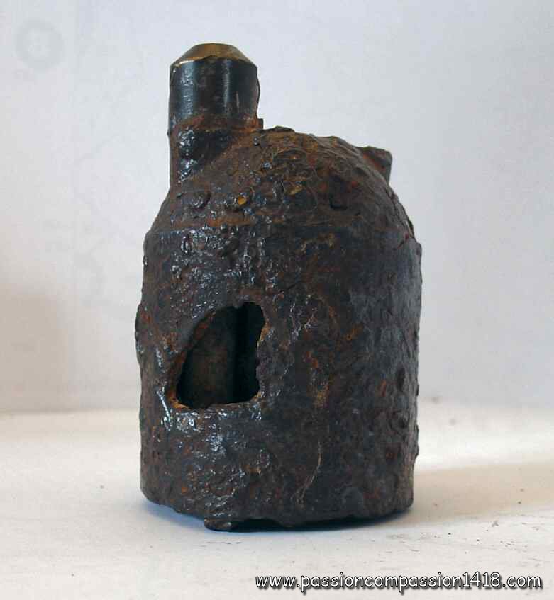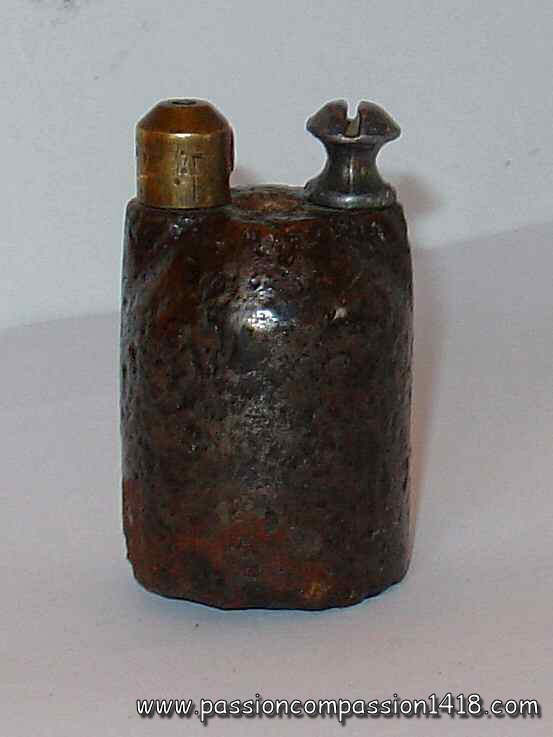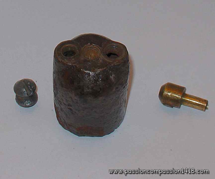 Pig Iron lighting grenade. Big filling hole, and one of the two ones linked by a tube. These ones seem to be protected by a brass-like material. |