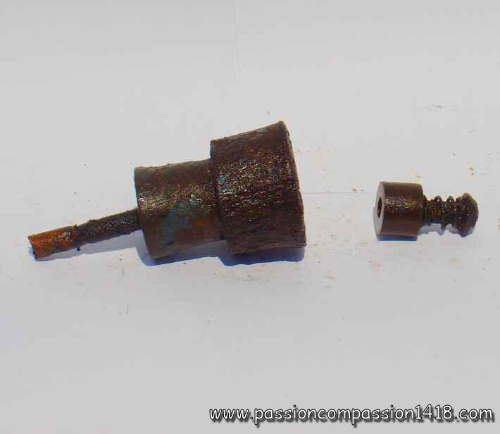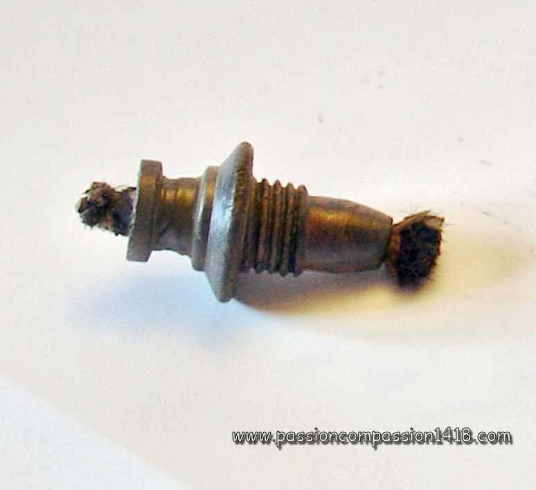 Grenade F1, bouchon allumeur à percussion modèle 1915 démonté. Remarquer le rugueux en tête du bouchon et la longueur de la colonne qui le porte. |
