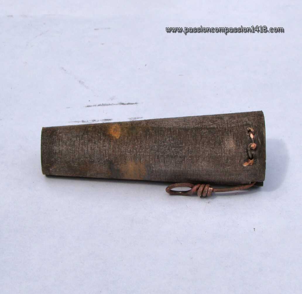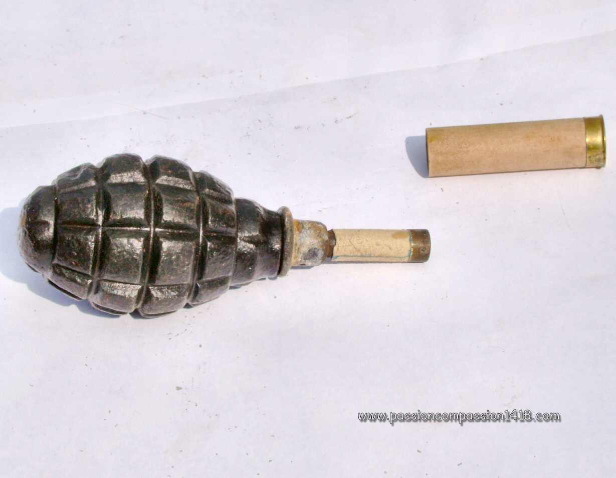 - model 1915 percussion ignition plug, made with a 5 seconds wick inside a lead tube logée dans un tube en plomb, connected at one end to a detonator, and at the other end to a 9mm diameter cardboard tube with a percussion pin at its top. This system was covered by a sliding 12mm diameter cardboard whose inner bottom was equipped with a starter. The whole assembly was finally protected ba a last cardboard tube that was indeed a hunting ammunition cartridge. The grenade ignition was triggered by removing the protection tube, then hittng the head of the percussion tube, propulsing the starter to the percussion pin, that would ignite the 5 seconds wick