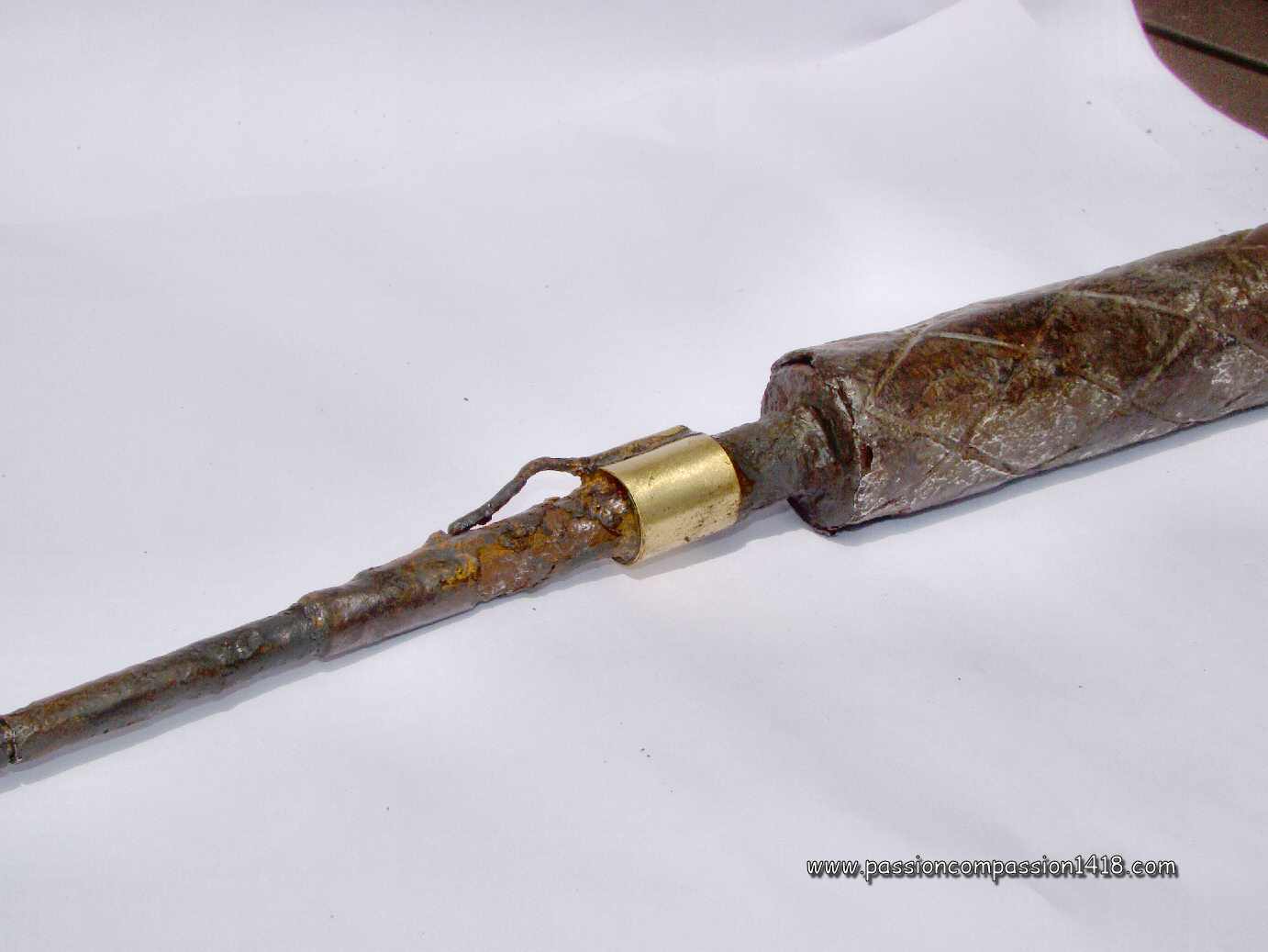 This other one, hopefully cut in two by a deficient fragmentation, show us its inner grooves (observed on the 'Chemin des Dames'). The central tube and detonator tube both disappeared. |