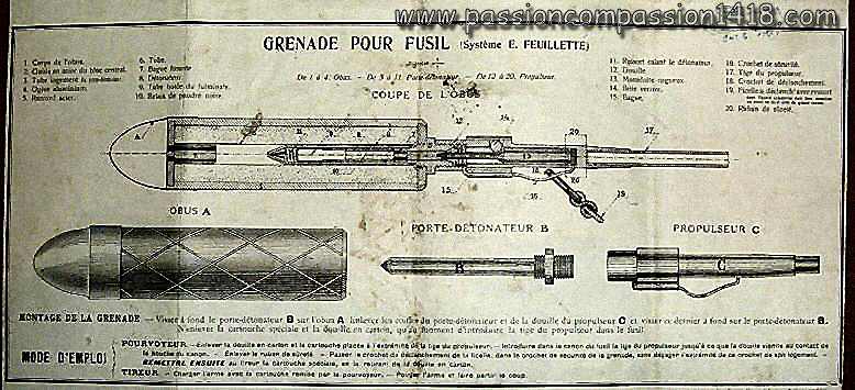 At the beginning of the war, the French Armies arsenal was not including any rifle grenade, although interesting in many tactical situations where short range immediate extra firepower is needed. For that reason, France first equipped with Martin-Hale Nr2 British grenades, awaiting for the development of a French design. This latter, the grenade Feuillette, is a weapon comparable to the English and German ones already in service.