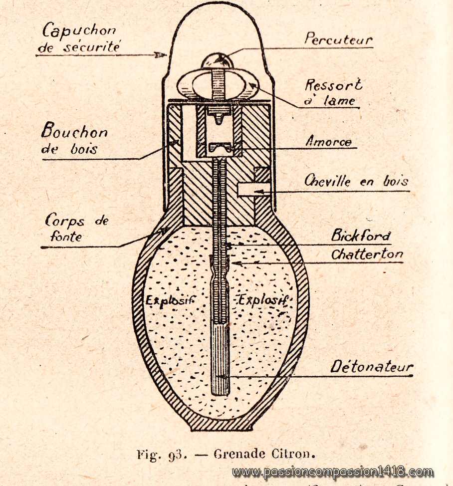 Its 'citron' ('lemon') nickname was obviously given by its very recognizabe profile. Despite its rudimentary design and its relative dangerosity, its lean manufacturing cost and process allowed this grenade to be made by a lot of manufacturers and available in big quantities, and therefore massively used from 1916 until the end of the war.
