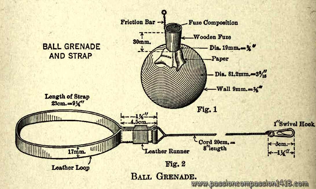 In 1847 the size of the sphere was reduced in order to reduce the weapon weight (1kg200 instead of 1kg900). In 1876 a slightly less rudimentary fuze was introduced, with a traction igniter to replace the direct firing of the wick, and finally in 1886 came a new version, a little bit more waterproofed.