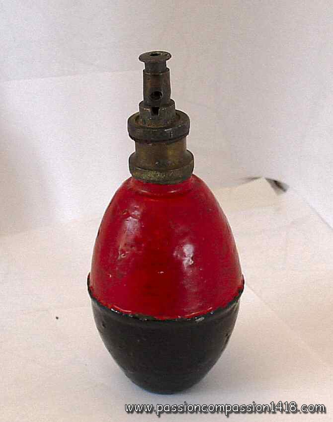 In 1914, a grenade Suffocante modèle 1914 is introduced. Its ovoid profile, initally made of brass with an inner tin cover (in order to resist to the irritating liquid corrosion), then of iron with an inner lead cover (for the same purpose) contains the tear gas liquid. A color code designated the leaded iron models (upper body painted in red) from the tinned brass ones (red belt on the plug).