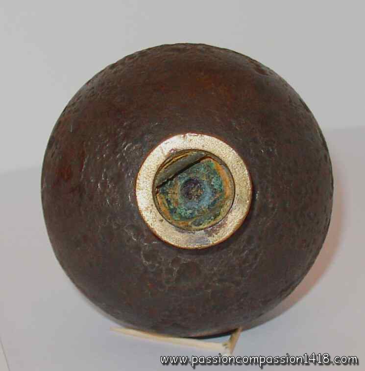 Model 1914 grenade, upper view. One can see the hole where the traction igniter wire was passing through |