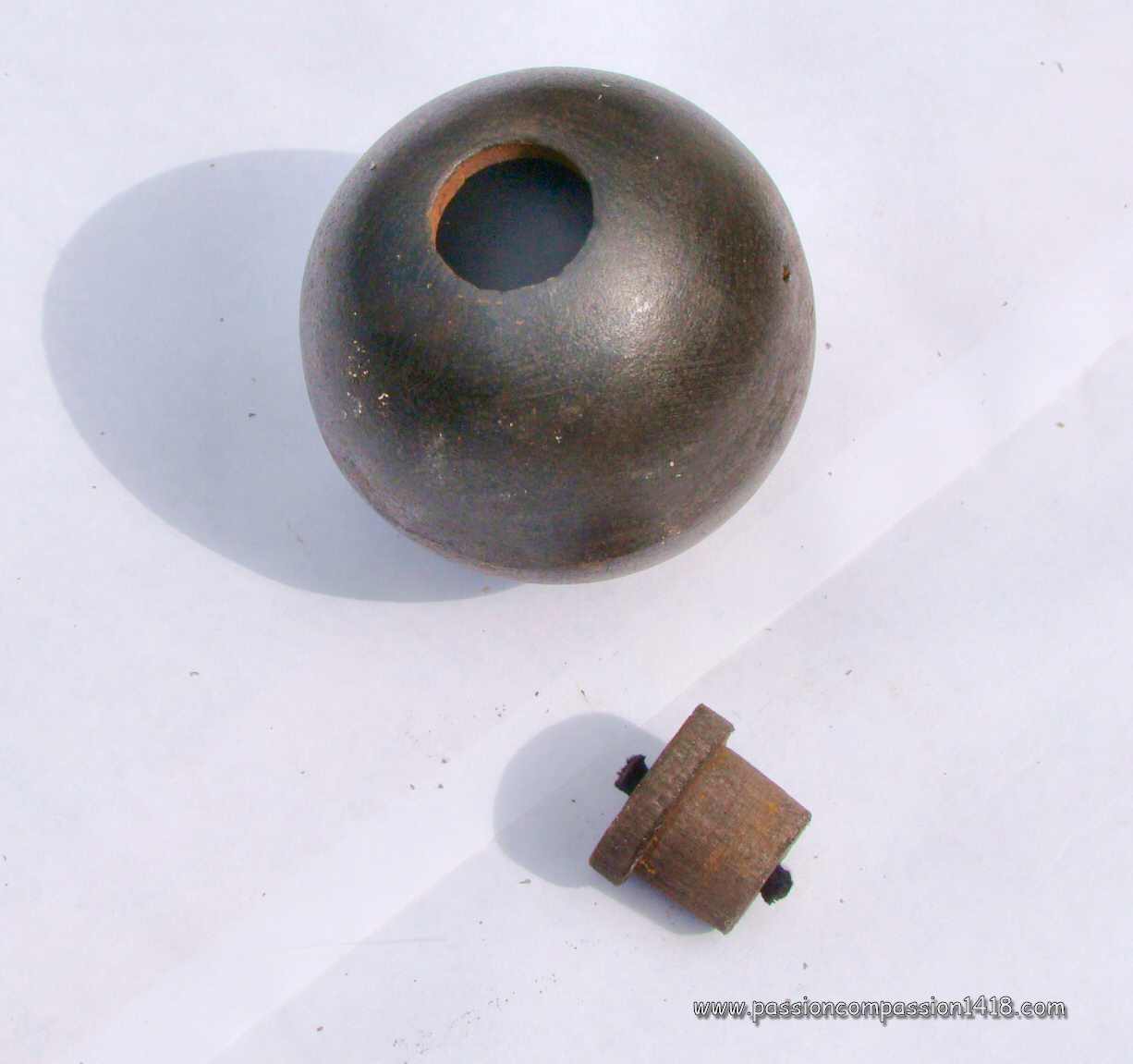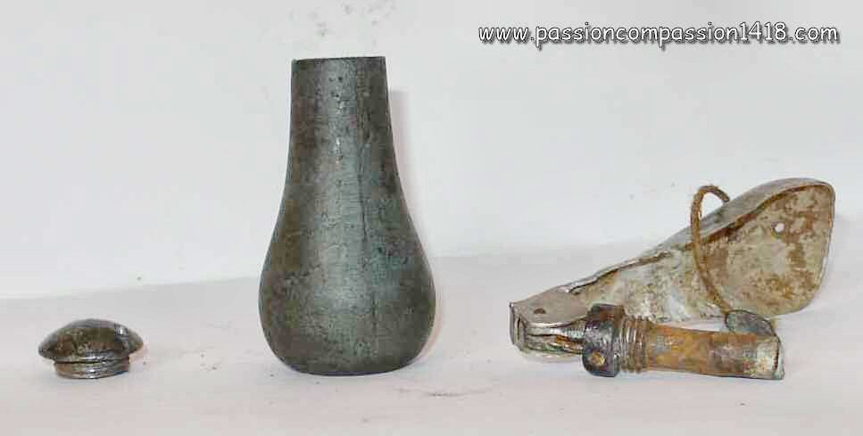 'Pear' grenade - the specific shape designed to make the base heavier and induce vertical landings is justifying that other 'pear grenade' nickname. Dismounted igniter and bottom plug. |
