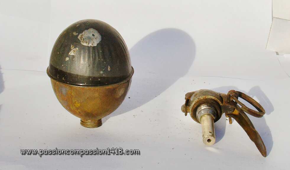 The grenade OF1 (offensive n°1) that appears in 1915 corresponds to that specification, with a reduced action range. It is composed of two stamped iron hemispheres crimped together and tin welded. The igniting plug was screwed inside the upper hemisphere, whose complex forming needed that part to