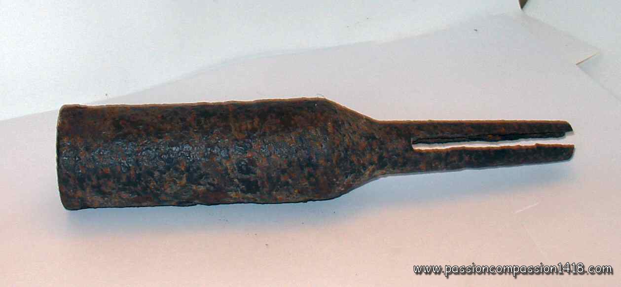 Pig Iron lighting grenade. At the right, the smaller of the 4 holes, that was probably used for the friction igniter. |