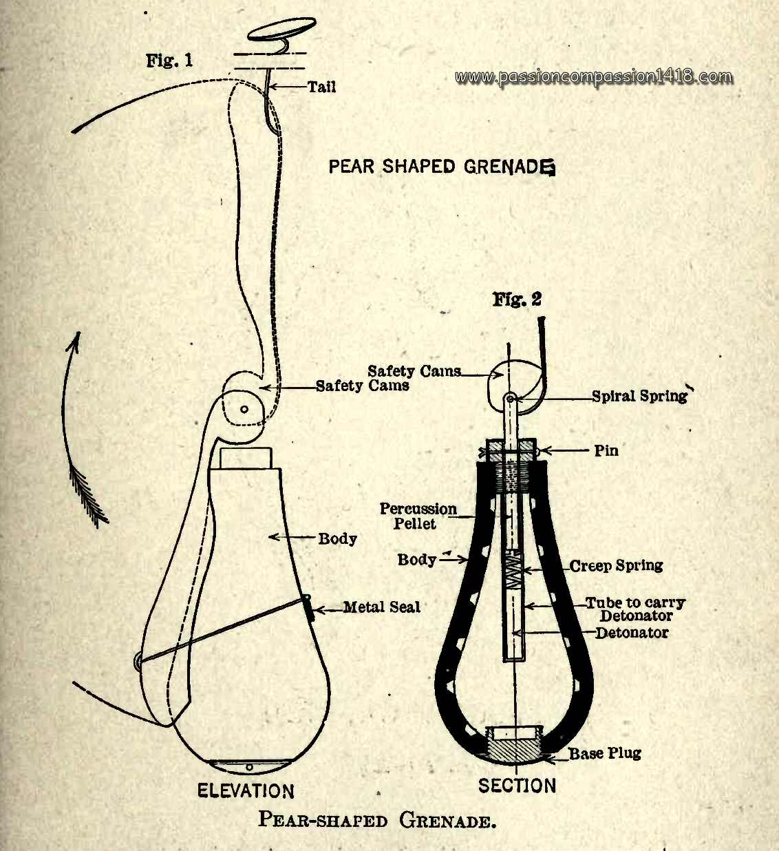 This new weapon was almost immediatly nicknamed 'Pear grenade' or 'Spoon grenade' by the fighters, because of evident reasons understandable with just a look on the pictures. The grenade was made of a pig iron body with inner fragmentation grooves, closed at its base by a lead plug, and on the top by the igniter mechanism. This mechanism was composed by a detonator triggered by a starter that was hit by a moving percussion pin when the grenade landed vertically on its base. This percussion movement was only possible when the spoon-like lever was up. A security wire wrapping the spoon lever and the grenade body at rest had to be cut prior to launching the grenade, so that the rotation of the lever was possible.