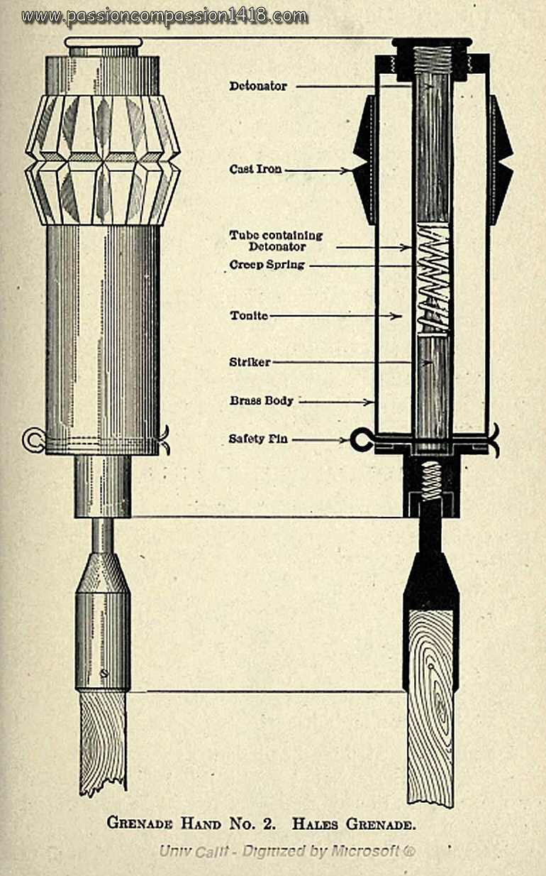 Using the same technological basis than the reglementary percussion hand grenade N°1 MkI, MKII and MkIII General Service made by the Woolwich Royal Laboratory (1908) issued from the Boer war experience, the private company Marten Hale Cotton Powder Ltd was already manufacturing a percussion grenade for the Mexican Army in 1907. Facing the insufficient production of the reglementary grenade N°1 compared to the British Army needs in 1914, the headquarters adopt this private grenade and name it the Rifle and hand grenade N°2 MKI (the French army will use it as well shortly). |