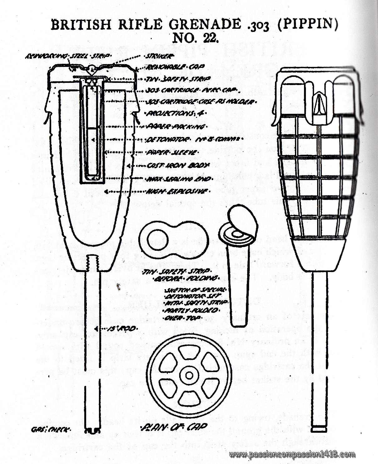 From May 1915, the British Army organizes in Hazebrouck the manufacturing of prefragmented hand grenades having the shape of a grapefruit grain (in French 'Pépin') named 'Hand grenade Newton Pépin'. Dangerous, they will inspire the French grenade Citron Foug, as well as the British rifle grenade N°17 MkI (June 1917), that has been rapidly improved to become the rifle grenade N°22 Mk I. |