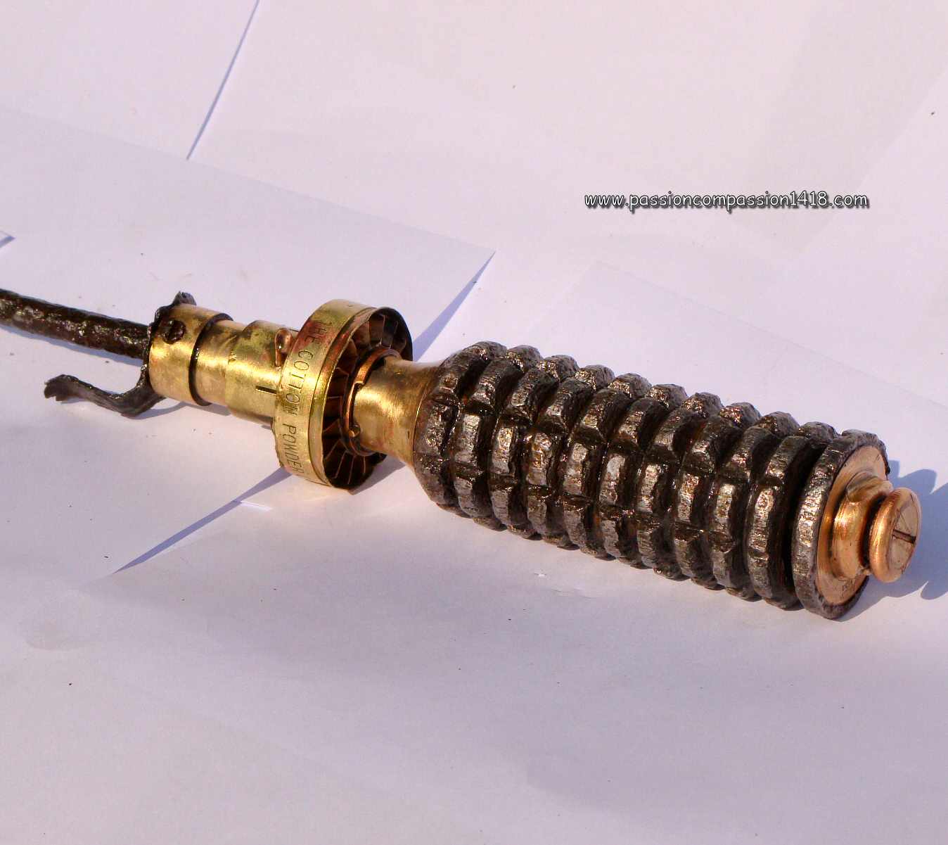 Just like most of the fighting nations armies, Great Britain Army had to compensate the lack of reglementary grenades at the beginning of the war by a parallel production of improvised weapons. The Battye grenade was born in 1915 and was an idea of a major named Battye, built on the basis of a simple prefragmented cylinder made in Bethune (France) by the thousands. The use of improvised grenades such as this one was forbidden at the end of 1915 in the British Army, because of too numerous accidents. Total weight 550 g including ammonal explosive load |