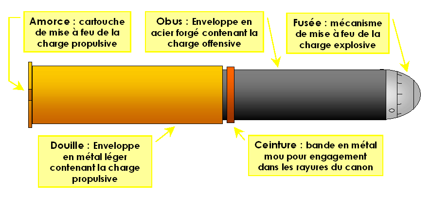 Les obus à balles constituaient en 1914 les munitions principales de l'artillerie de campagne. Destinés à exploser au-dessus des formations ennemies par l'usage d'un mécanisme de mise à feu spécifique (fusée à temps) , ils dispersaient une gerbe mortelle de fragments et de balles tout en produisant un nuage de fumée qui permettait aux artilleurs de régler leur tir.