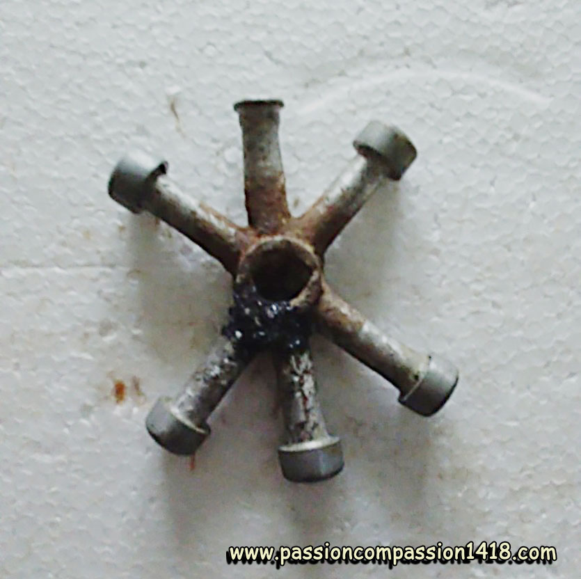 Grenade Tortue offensive ouverte. Vue sur les tubes et la petite étoile centrale. Photo par Luc Malchair. |
