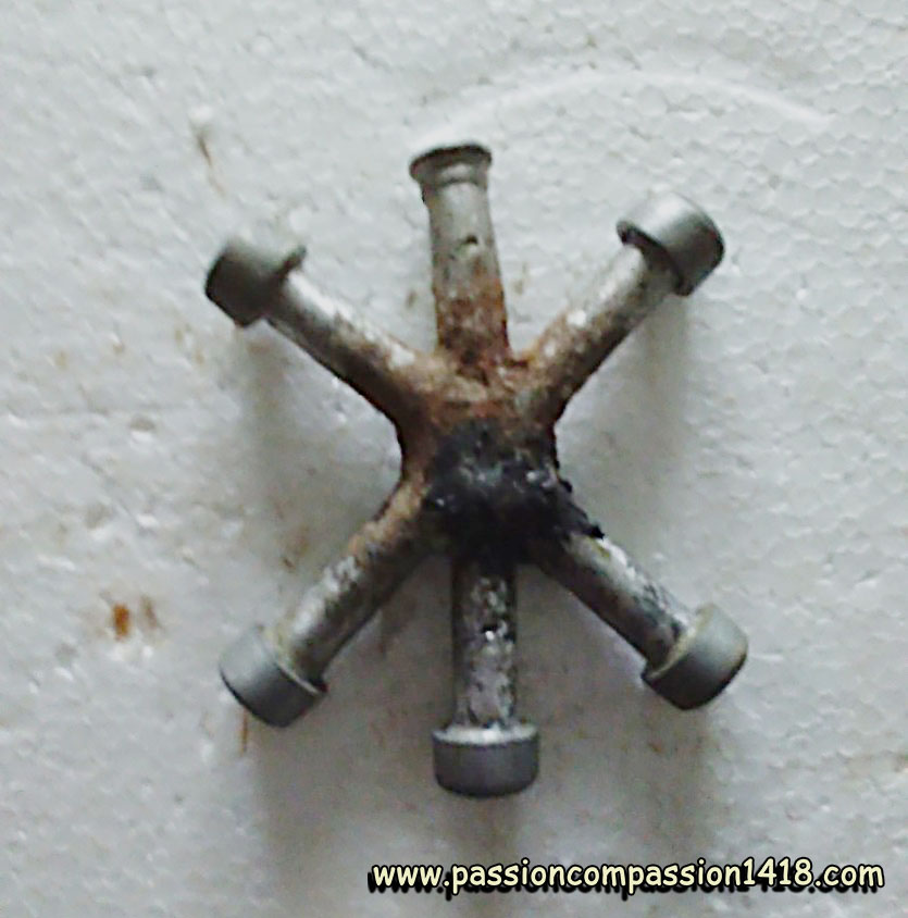 Morceaux de capuchons de manche de grenade à manche; la pièce en forme d'étoile est conçue pour faciliter le dévissage du bouchon dans des conditions boueuses... (Observé à Verdun - Mort Homme) |